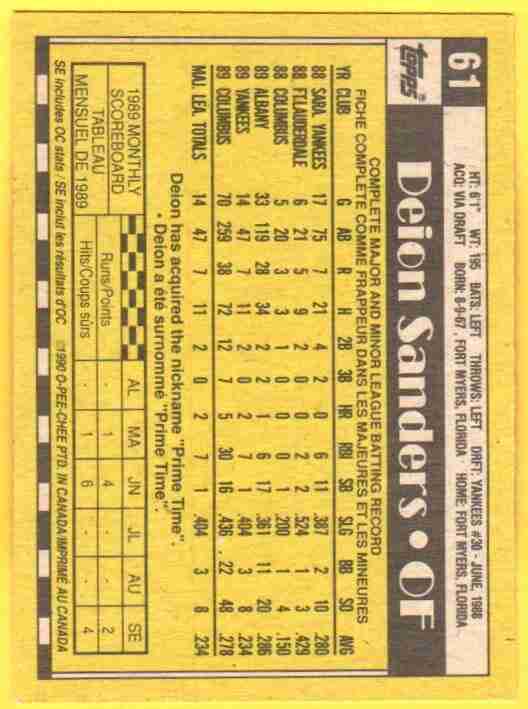Deion Sanders Rookie 1990 Topps #61 – Yankees – RC – Clean Card