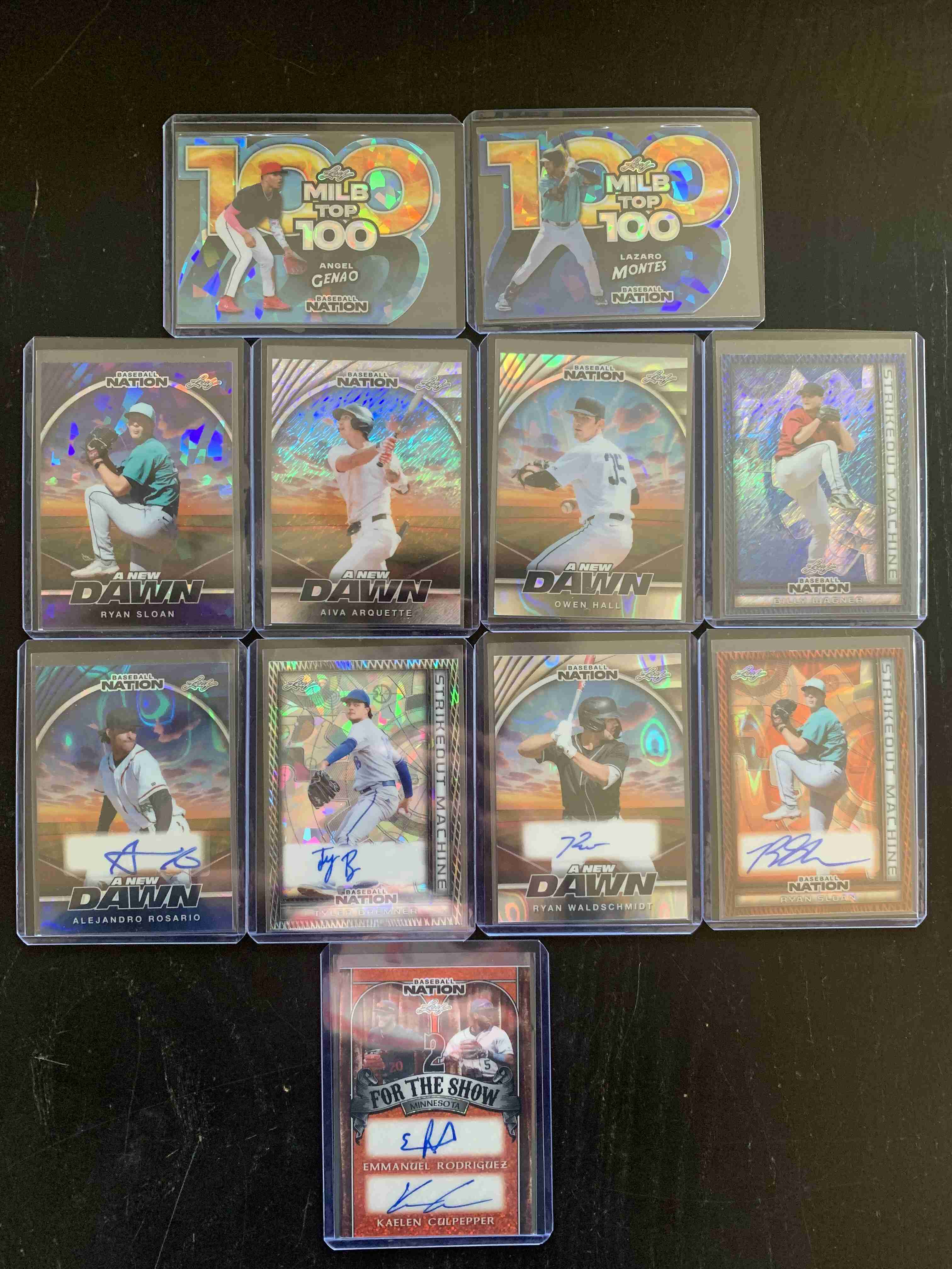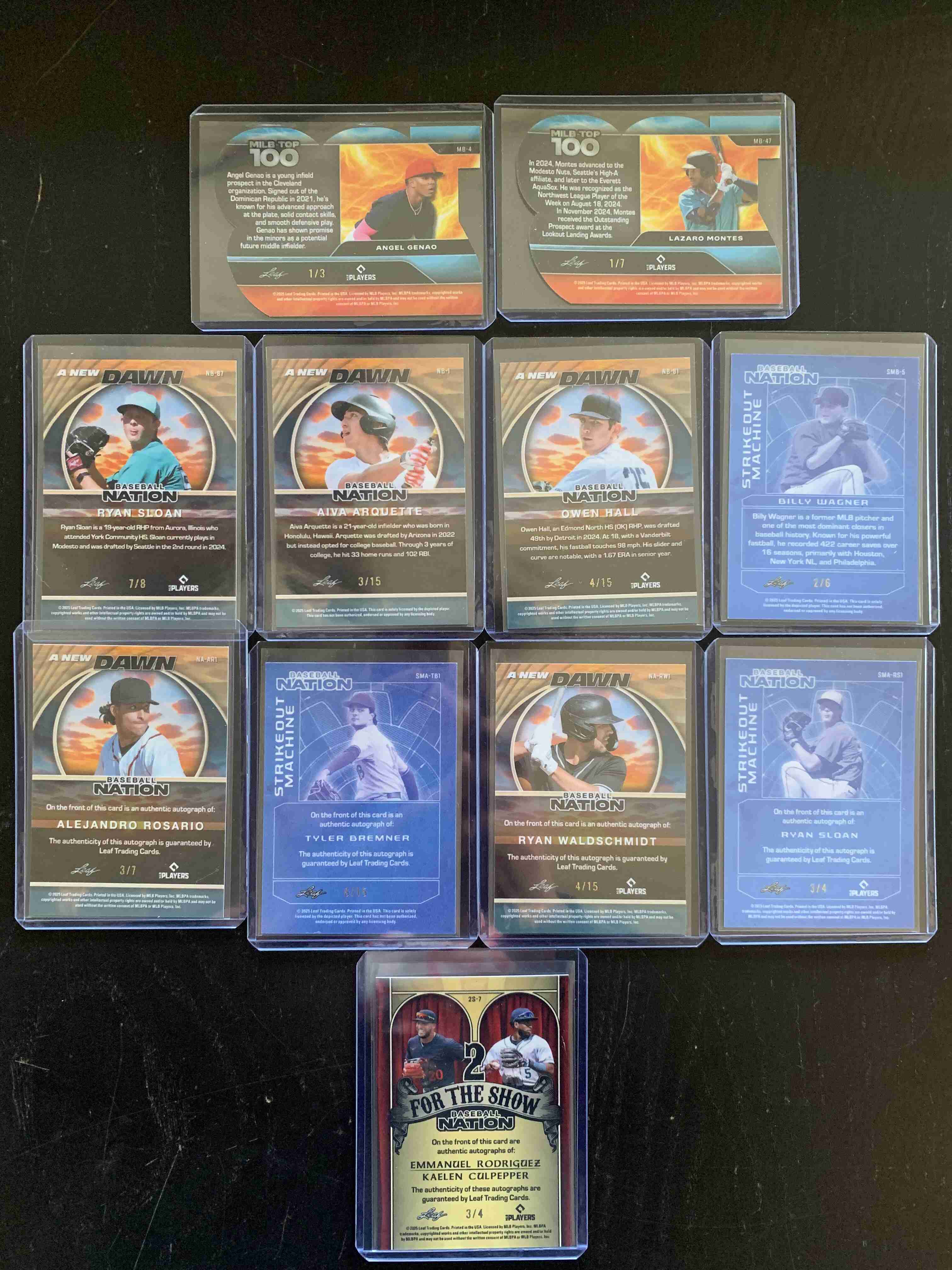 For auction is a lot of 11 cards from 2025 Leaf Baseball Nation. Lot includes Six (6) Parallel Cards, Serial-Numbered to 15 or Less and Five (5) Autographs, also Serial-Numbered to 15 or Less, including one DUAL AUTO (#'d 3/4). Lot includes the following - Lazaro Montes MiLB Top 100 #/7; Angel Genao MiLB Top 100 #/3; Billy Wagner Strikeout Machine #/6; Owen Hall A New Dawn #/15; Aiva Arquette A New Dawn #/15; Ryan Sloan A New Dawn #/8; Alejandro Rosario AUTO A New Dawn #/7; Tyler Bremner AUTO Strikeout Machine #/15; Ryan Sloan AUTO Strikeout Machine #/4; Ryan Waldschmidt AUTO A New Dawn #/15; and Emmanuel Rodriquez/Kaelen Culpepper DUAL AUTO 2 For the Show #/4. Lot does include top 100 prospects and a Hall of Famer. Overall Cards are NM; though there may be outliers. Please refer to photos for more details. THIS LOT SHIPS FREE, securely via USPS with Tracking.