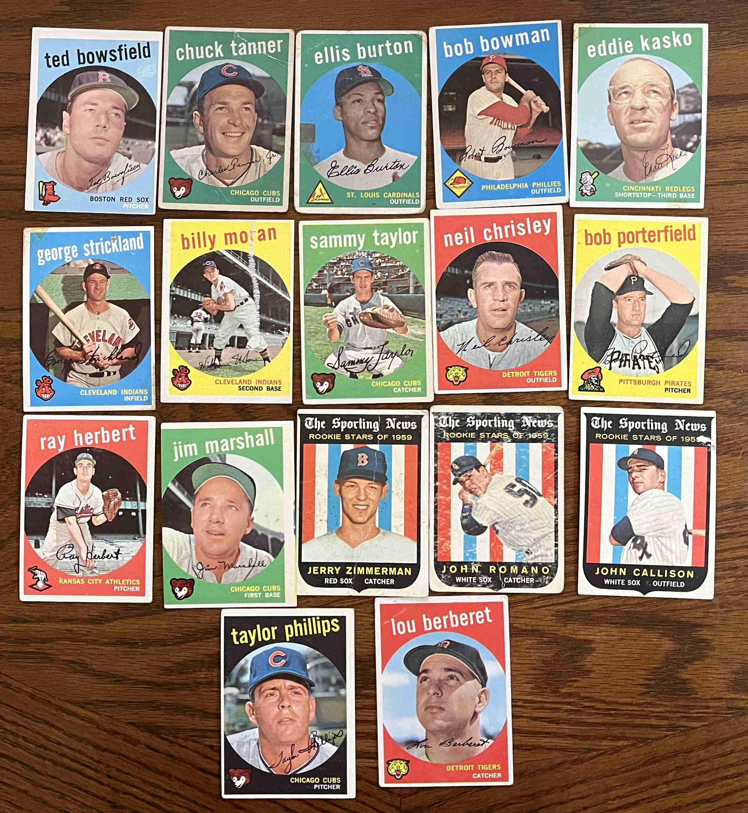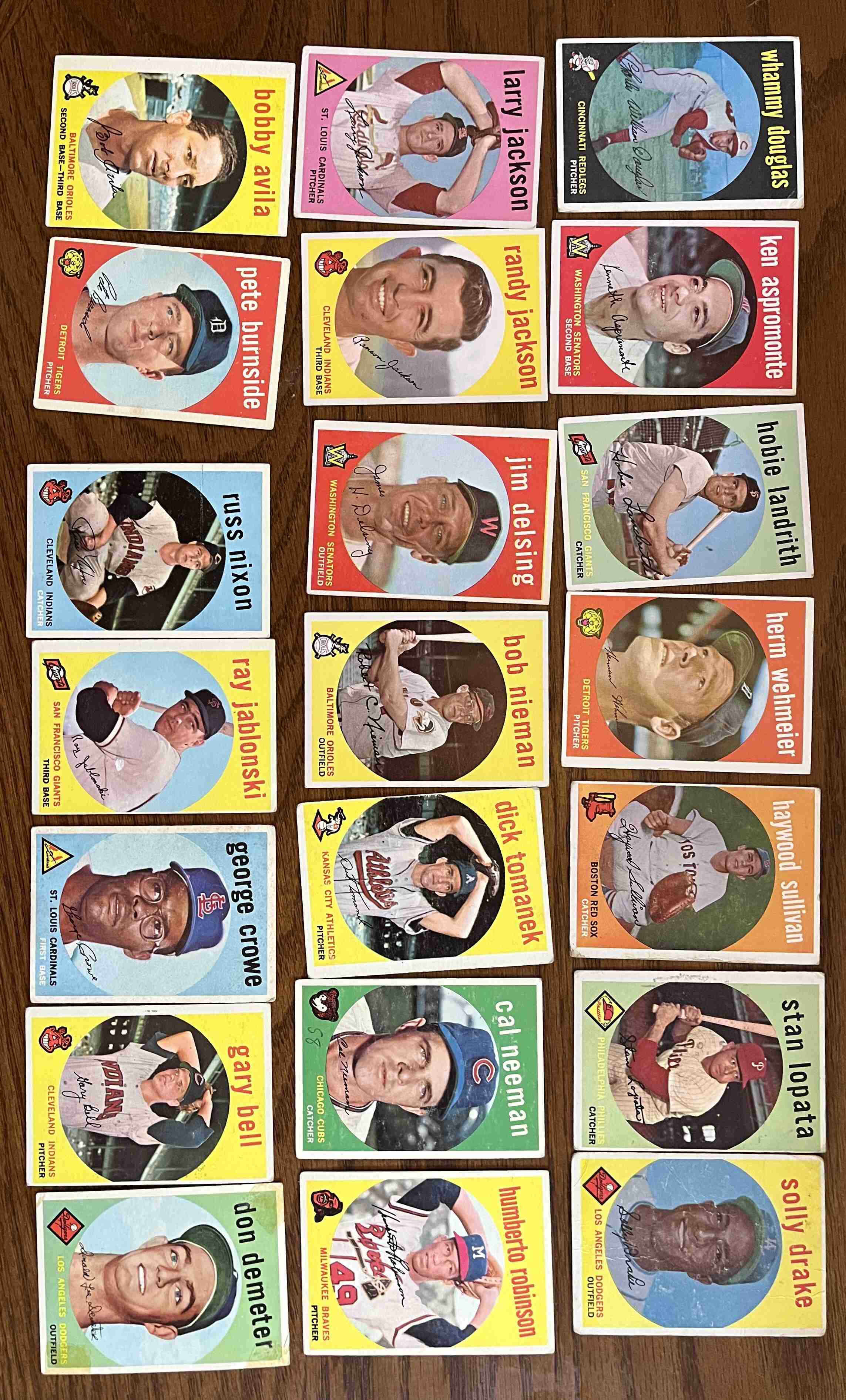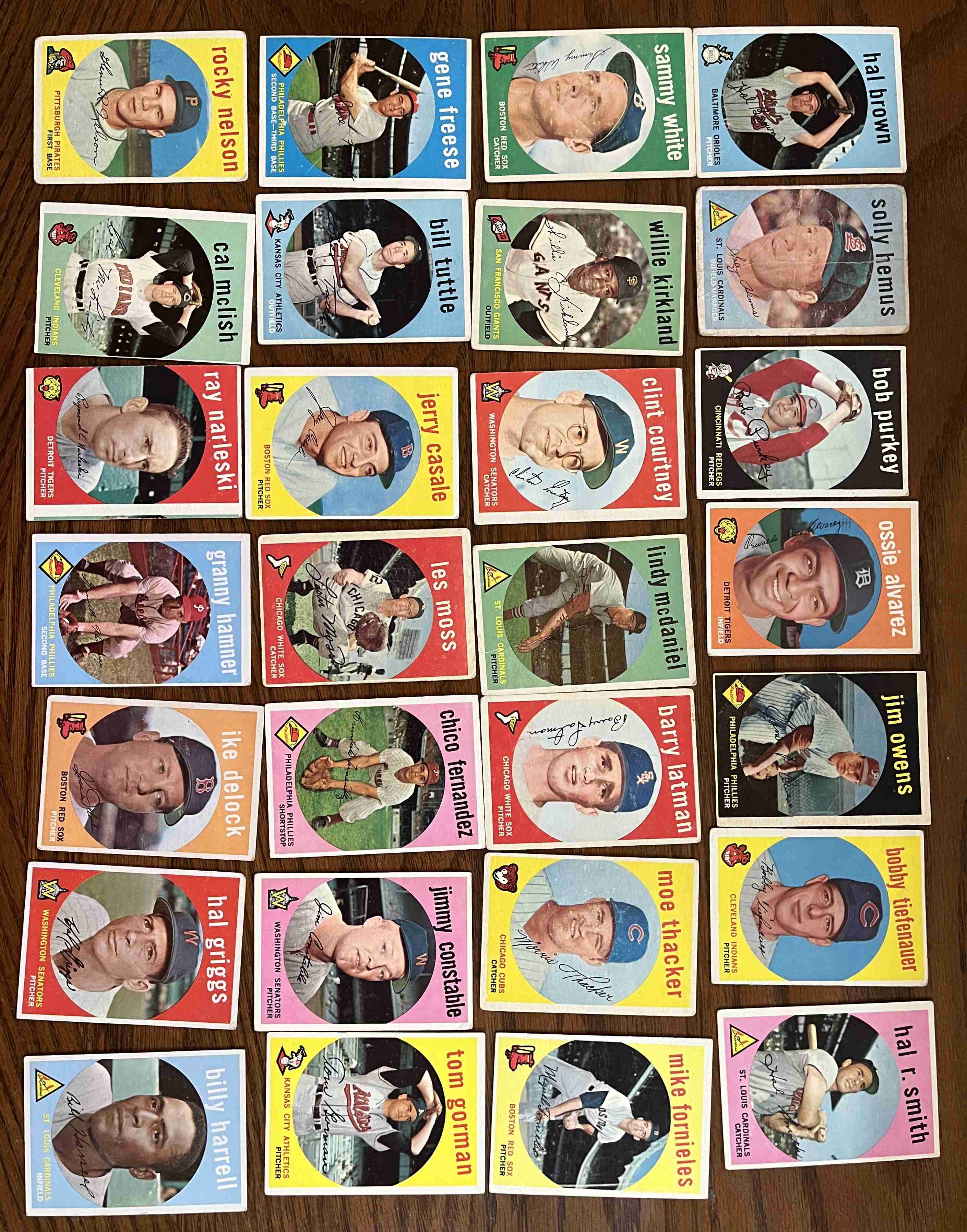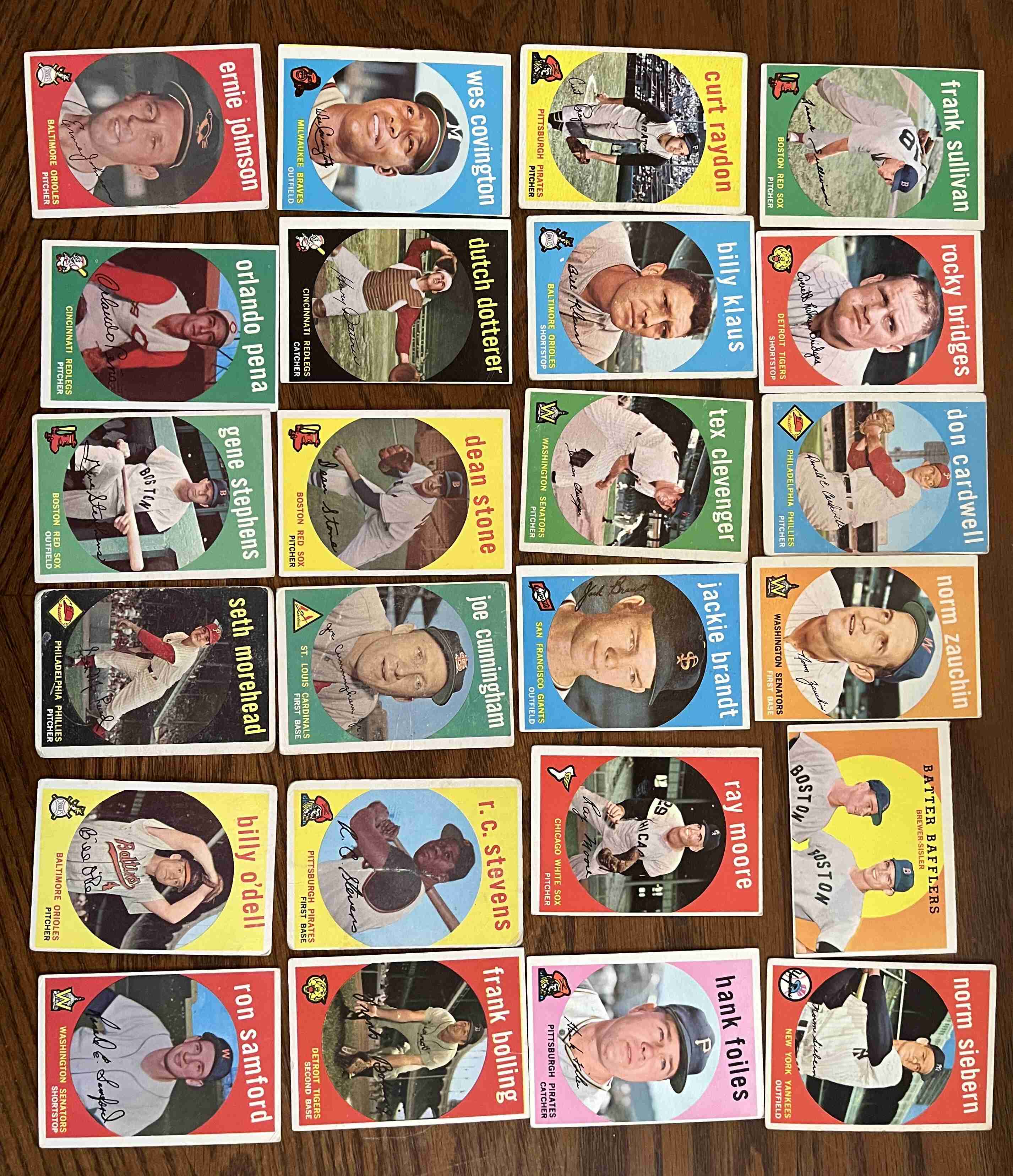 90 different 1959 Topps: #96, 113, 119, 138, 146, 153, 154, 181, 189, 193, 196, 207, 221, 231 WB, 232 GB, 234 WB, 236 WB, 242 WB, 250 WB, 253 WB, 261 WB, 271 WB, 279 WB, 280 GB, 282 WB, 285 WB, 286 WB, 288, 290, 293, 294, 297, 298, 299, 305, 308, 311, 314, 318, 323, 324, 327, 337, 342, 344, 346, 354, 363, 366, 367, 369, 375, 386, 394, 399, 406, 412, 416, 421, 422, 424, 431, 433, 434, 436, 437, 442, 445, 446, 449, 451, 452, 453, 456, 459, 472, 473, 474, 477, 479, 483, 484, 486, 487, 497, 501, 503, 504, 506, & 527 (poor). Average grade fair to VG. Grading is subjective, so please view the photos for condition.