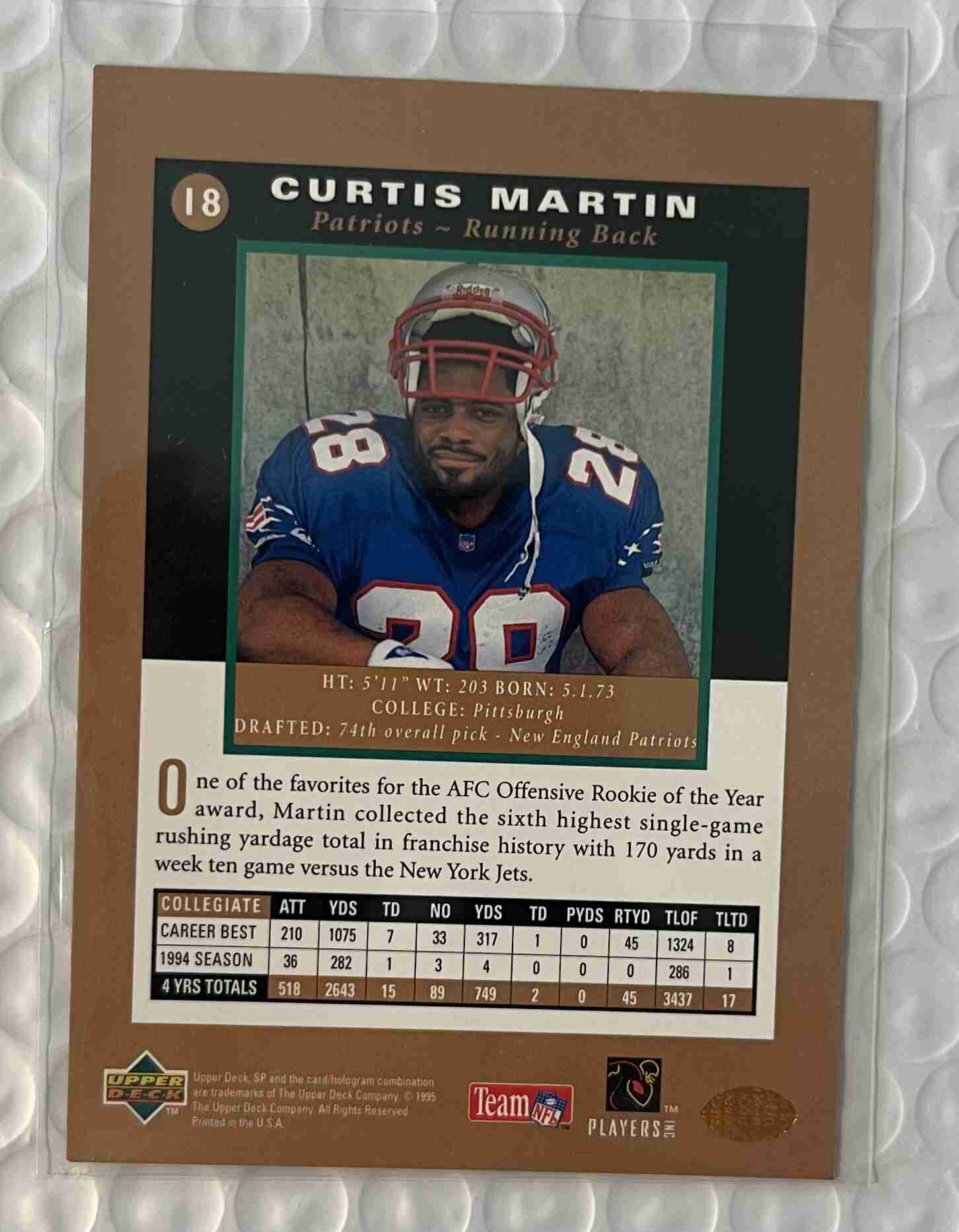 This auction is of a 1995 SP Curtis Martin Rookie card. Card is in Nrmt condition. Look at the pics and judge for yourself. If any questions please feel free to contact me. Thank you for looking at my auctions.