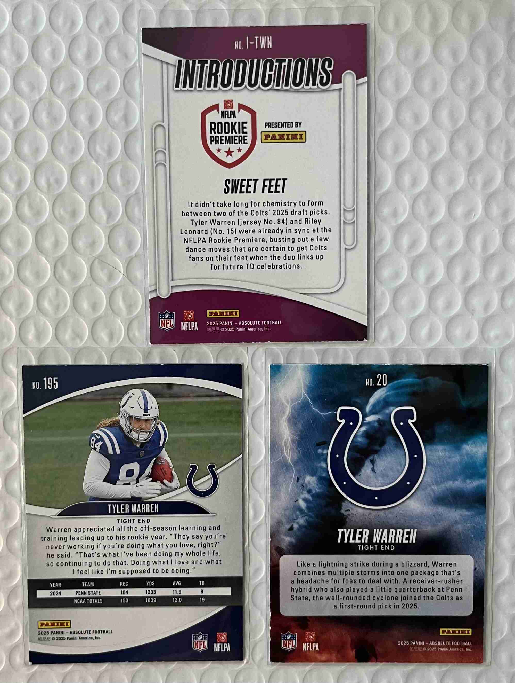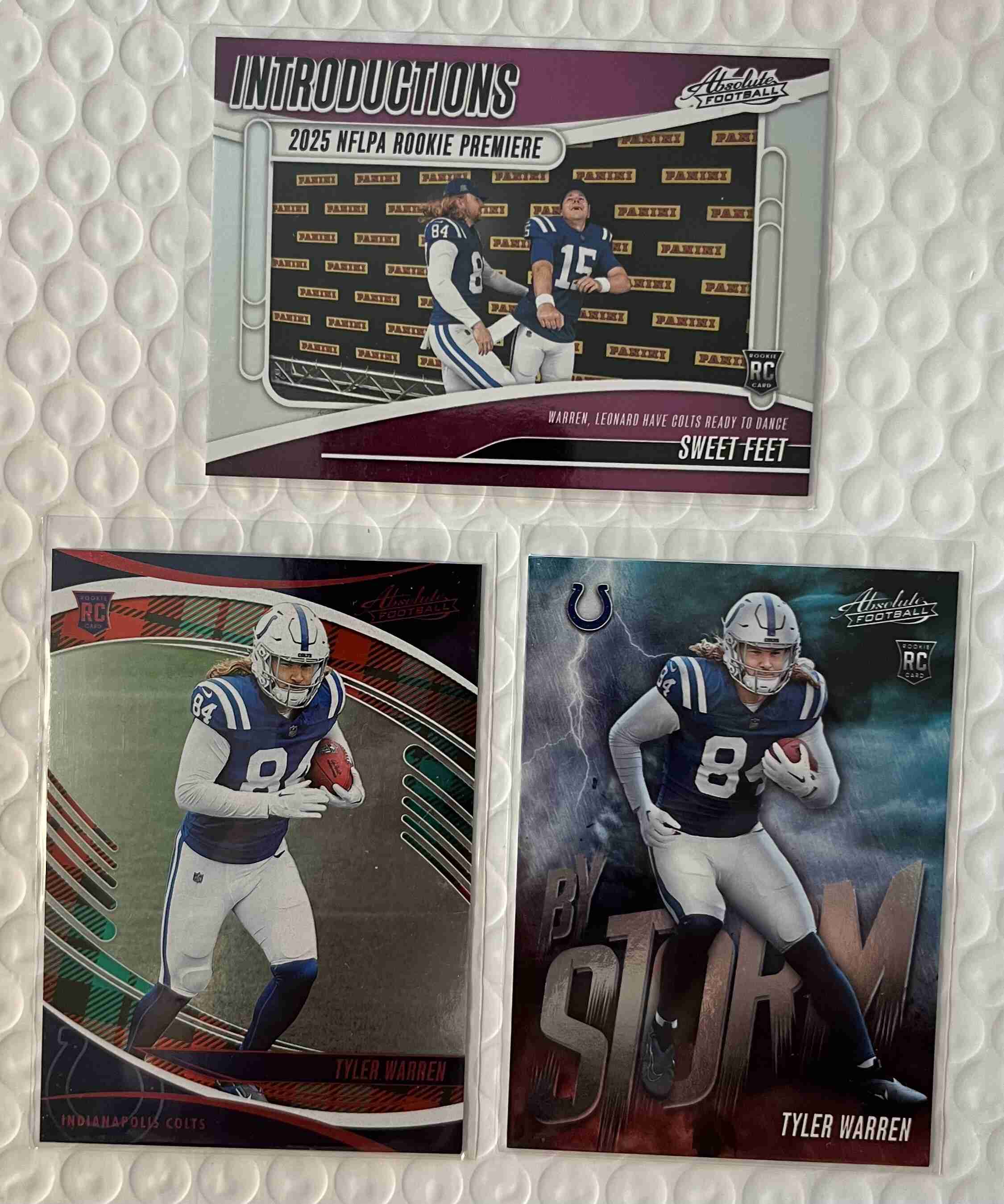 This auction is of a ( 3 ) Tyler Warren Rookie cards. Cards are in Nrmt condition. Look at the pics and judge for yourself. If any questions please feel free to contact me. Thank you for looking at my auctions.