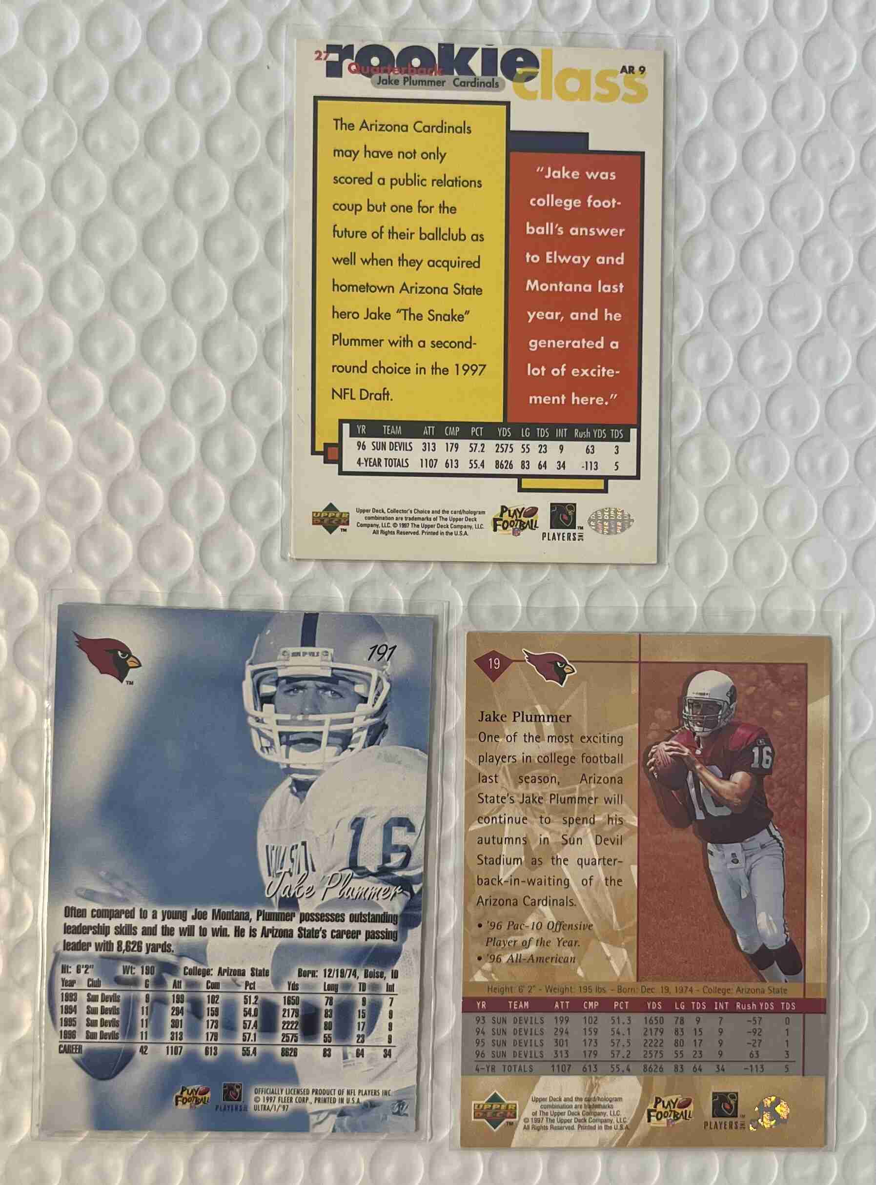 This auction is of a ( 3 ) Jake Plummer Rookie cards. Cards are in Nrmt condition. Look at the pics and judge for yourself. If any questions please feel free to contact me. Thank you for looking at my auctions.
