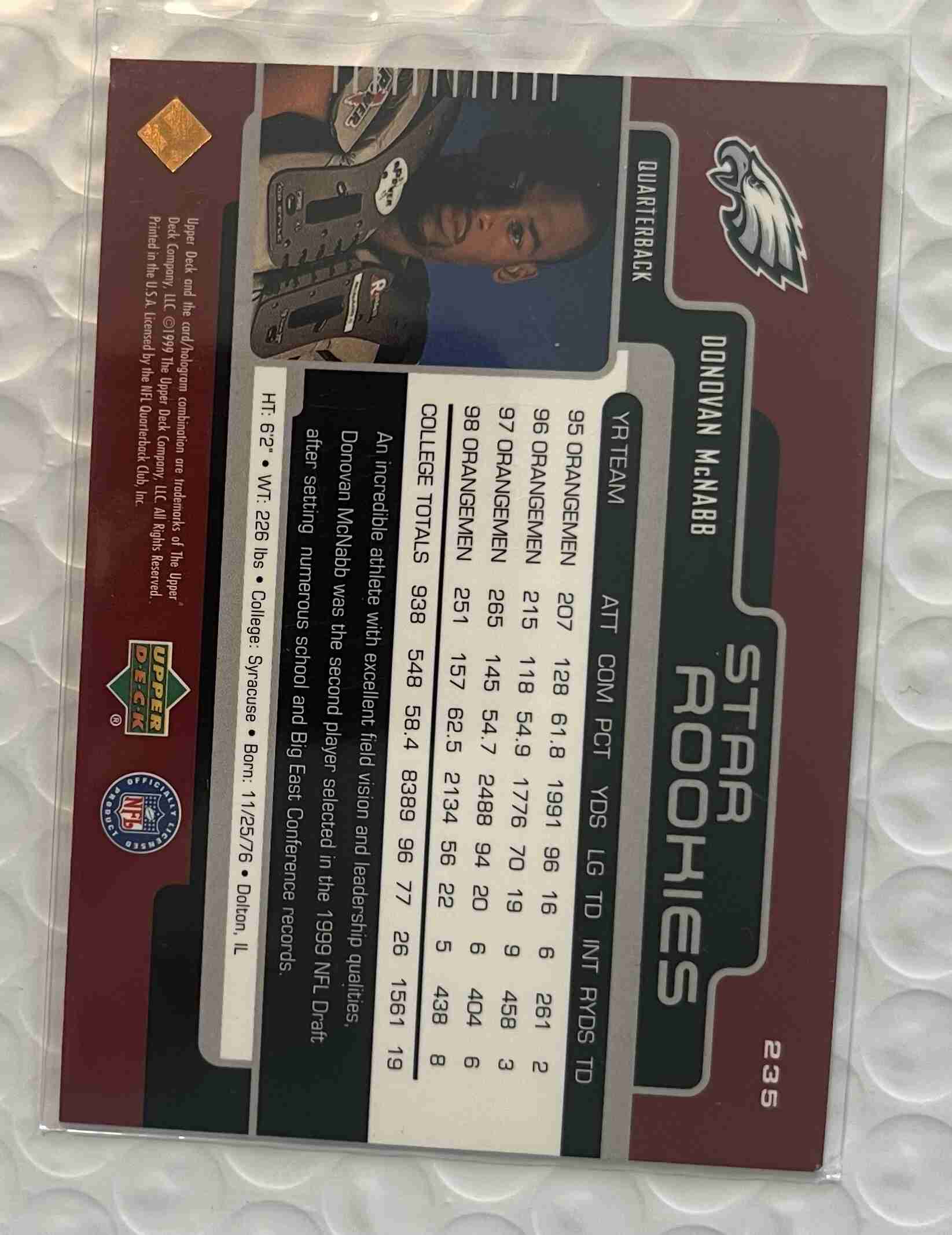 This auction is of a 1999 Upper Deck Donovan McNabb Rookie card. Card is in Nrmt condition. Look at the pics and judge for yourself. If any questions please feel free to contact me. Thank you for looking at my auctions.