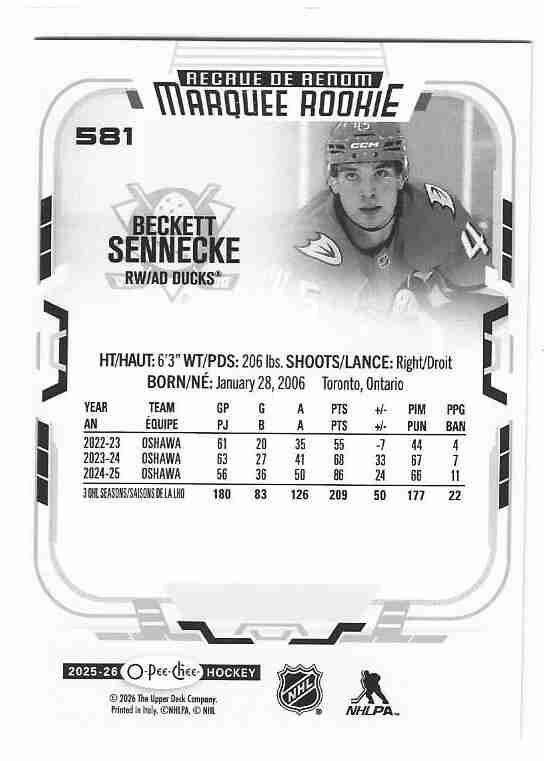 2025/26 OPC #581 BECKETT SENNECKE MARQUEE ROOKIE