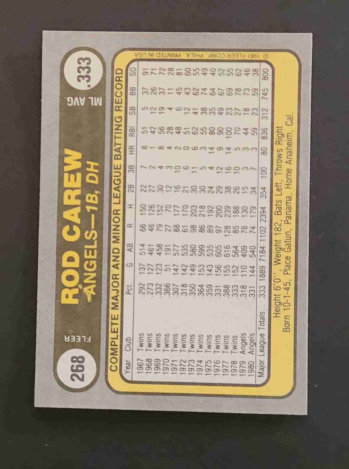 1981 Fleer #268 Rod Carew. California Angels. NrMt. Card came from wax boxes that I opened and has not been in circulation.