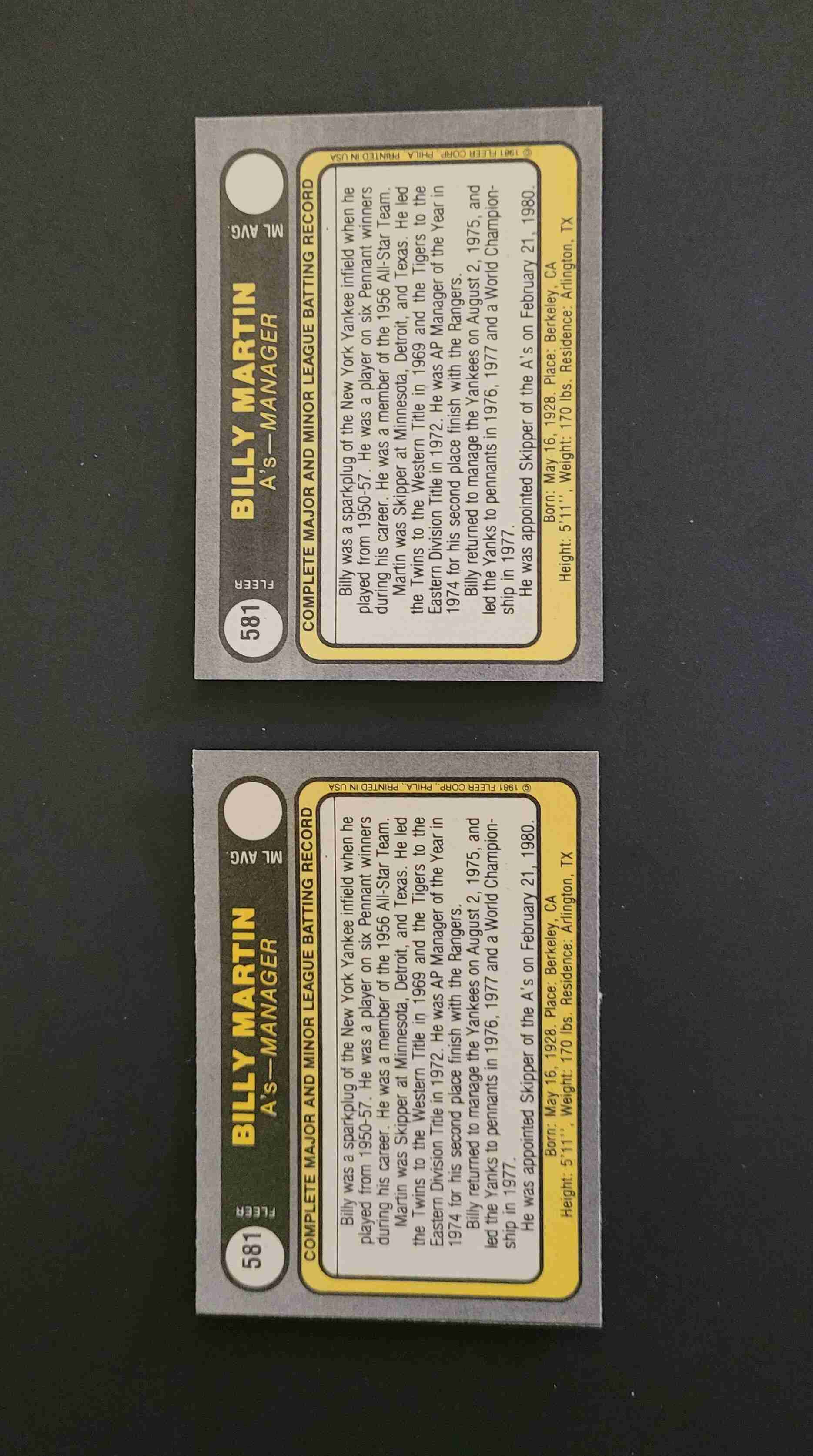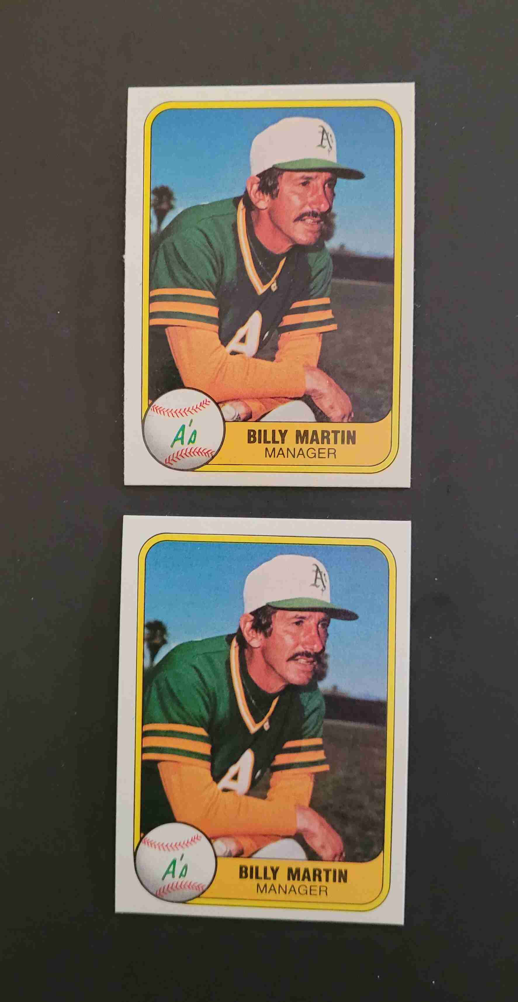 1981 Fleer #581 Billy Martin. Oakland A's manager. This is a pair. You get both cards. NrMt. Cards came from wax boxes that I opened and have not been in circulation.