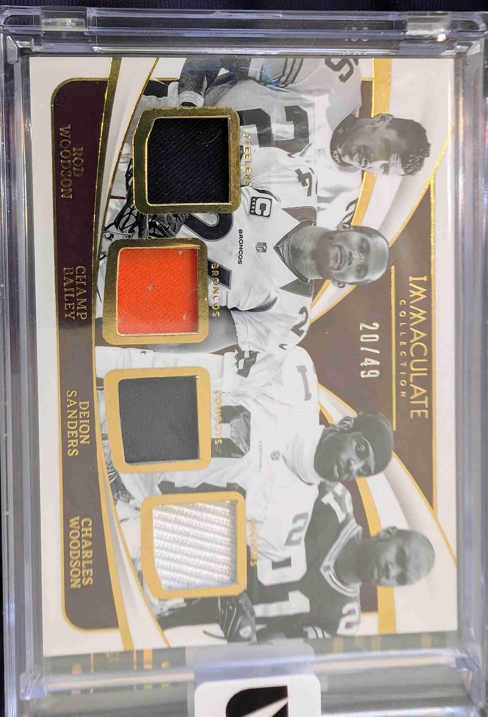 FOR AUCTION IS A 2024 PANINI IMMACULATE COLLECTION FOUR-PATCH CORNERBACK CARD. FEATURES ROD WOODSON, CHARLES WOODSON, CHAMP BAILEY AND DEION SANDERS. ALL IN THE HALL. CARD NUMBER IS IM-CB AND IS SERIAL NUMBERED 20/49. THICK CARD MAG IS INCLUDED AND CARD WILL SHIP IN MAG.