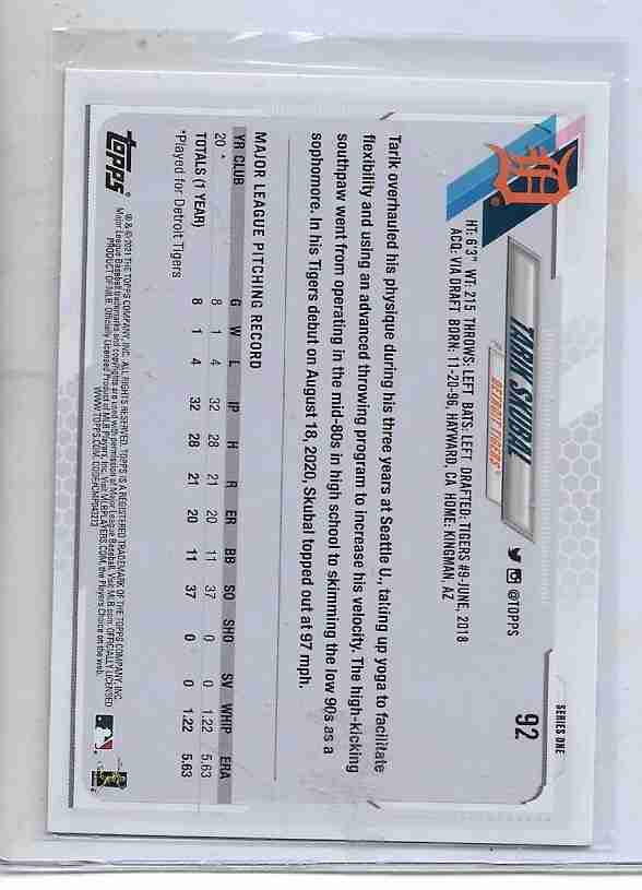 2021 Topps #92 ~ Tarik Skubal Detroit Tigers Rookie