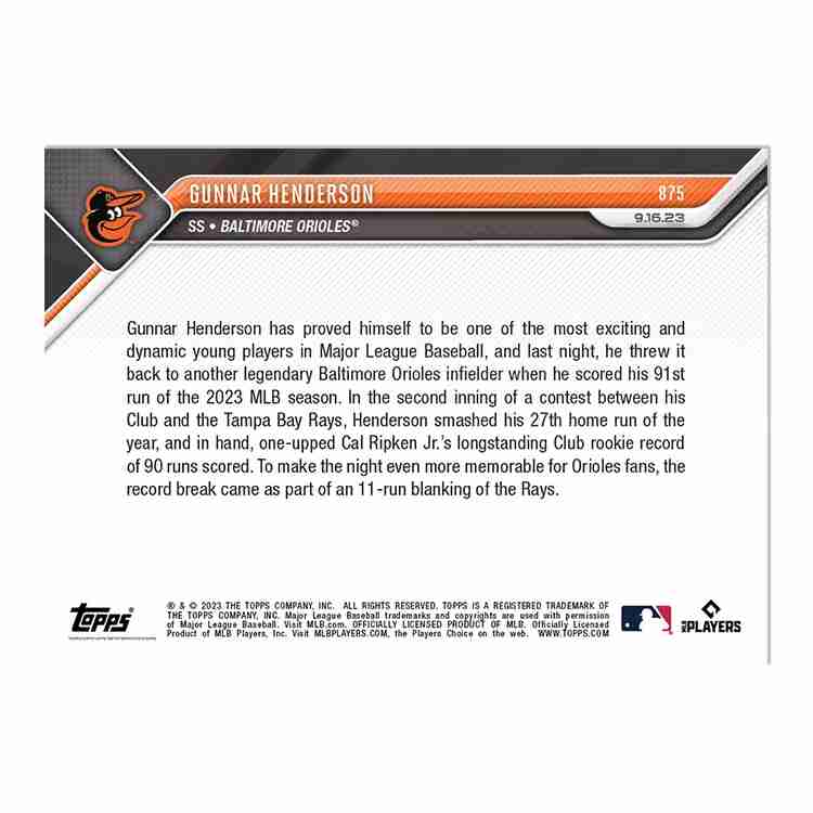 2023 Topps NOW 875 Gunnar Henderson Passes Ripken for Most Runs