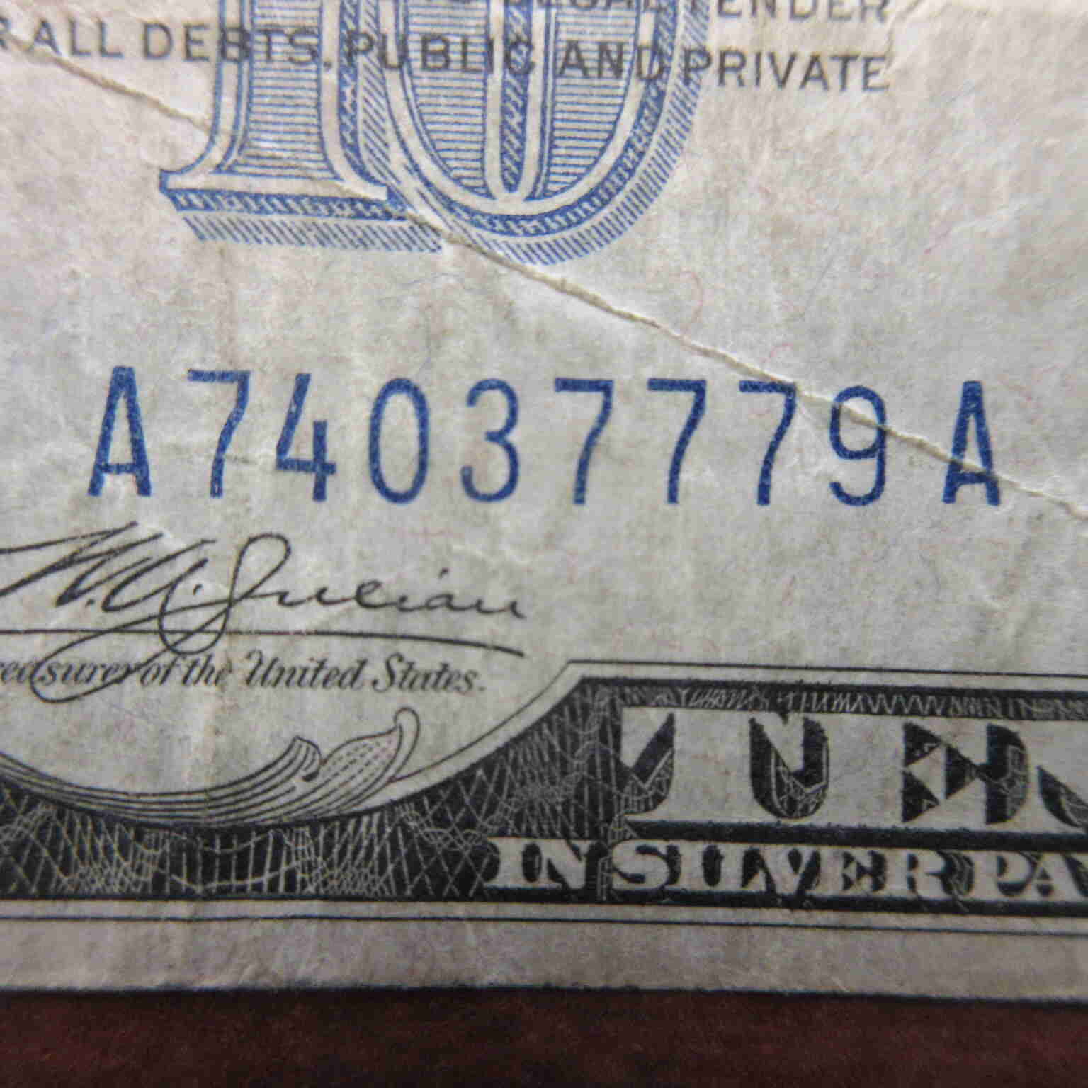 This is a 1934 U.S. 10 Dollar Silver Certificate with an AA Block Serial Number Alignment Error. The Serial Number "tilts" upwards as it goes to the right. It does not sit perfectly horizontal. This bill has minor creasing.