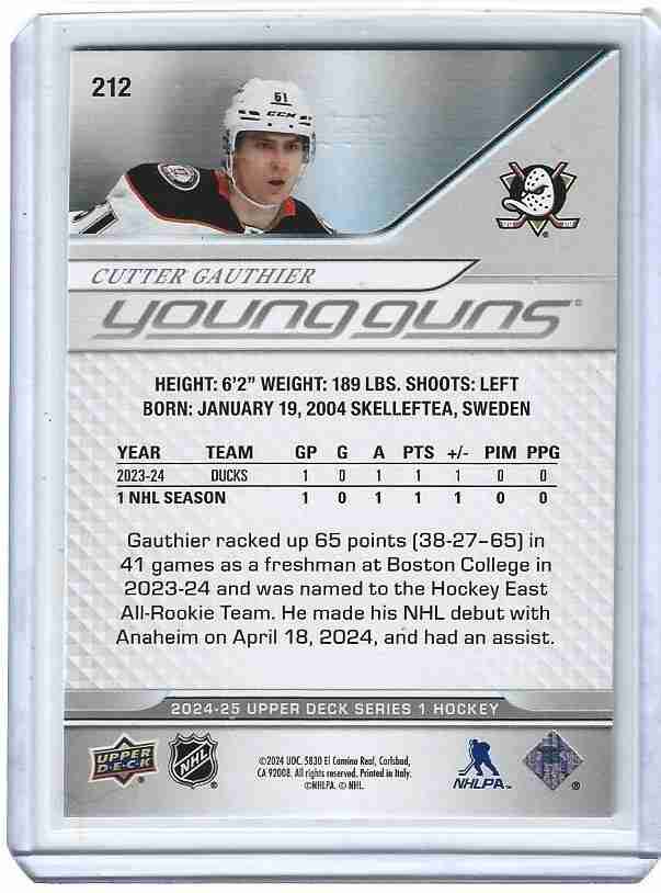 2024/25 UD 1 #212 CUTTER GAUTHIER YOUNG GUNS