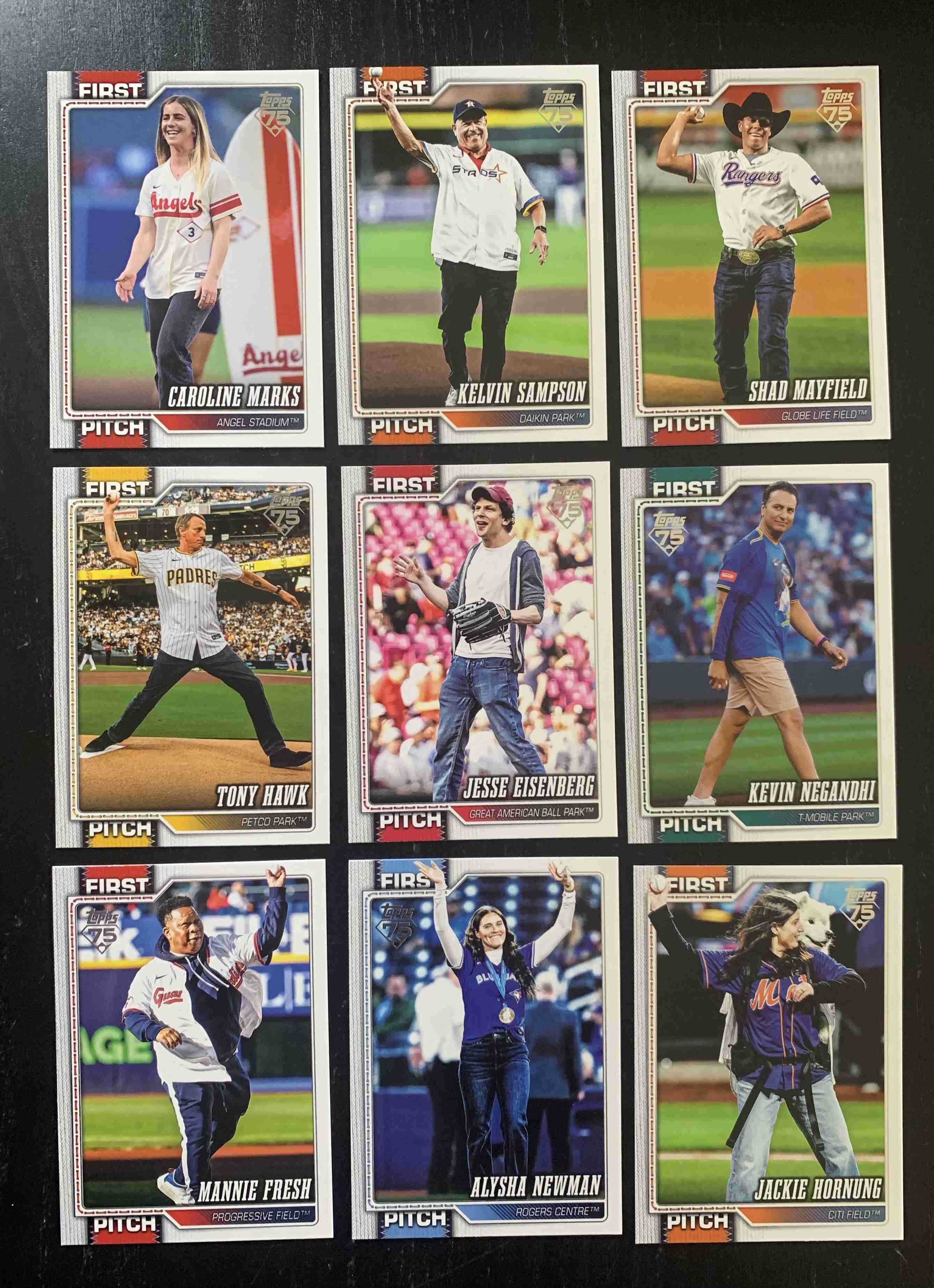 For auction is a complete 9 Card First Pitch Insert Set from the BRAND NEW 2026 Topps Series 1 Set. Overall Cards are NM or better, though there may be some outliers. Please refer to photos for more details. Cards ship securely with tracking via USPS