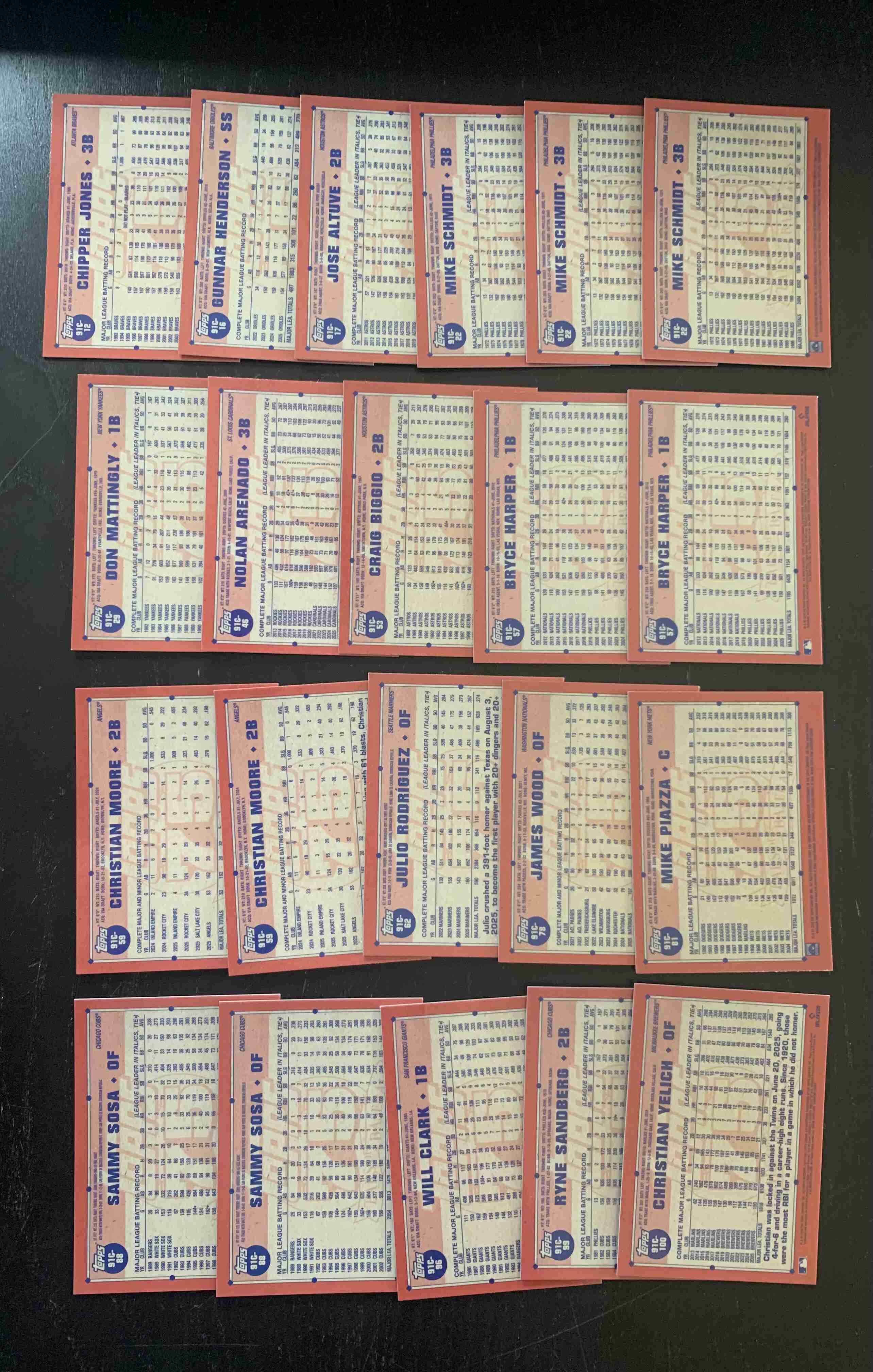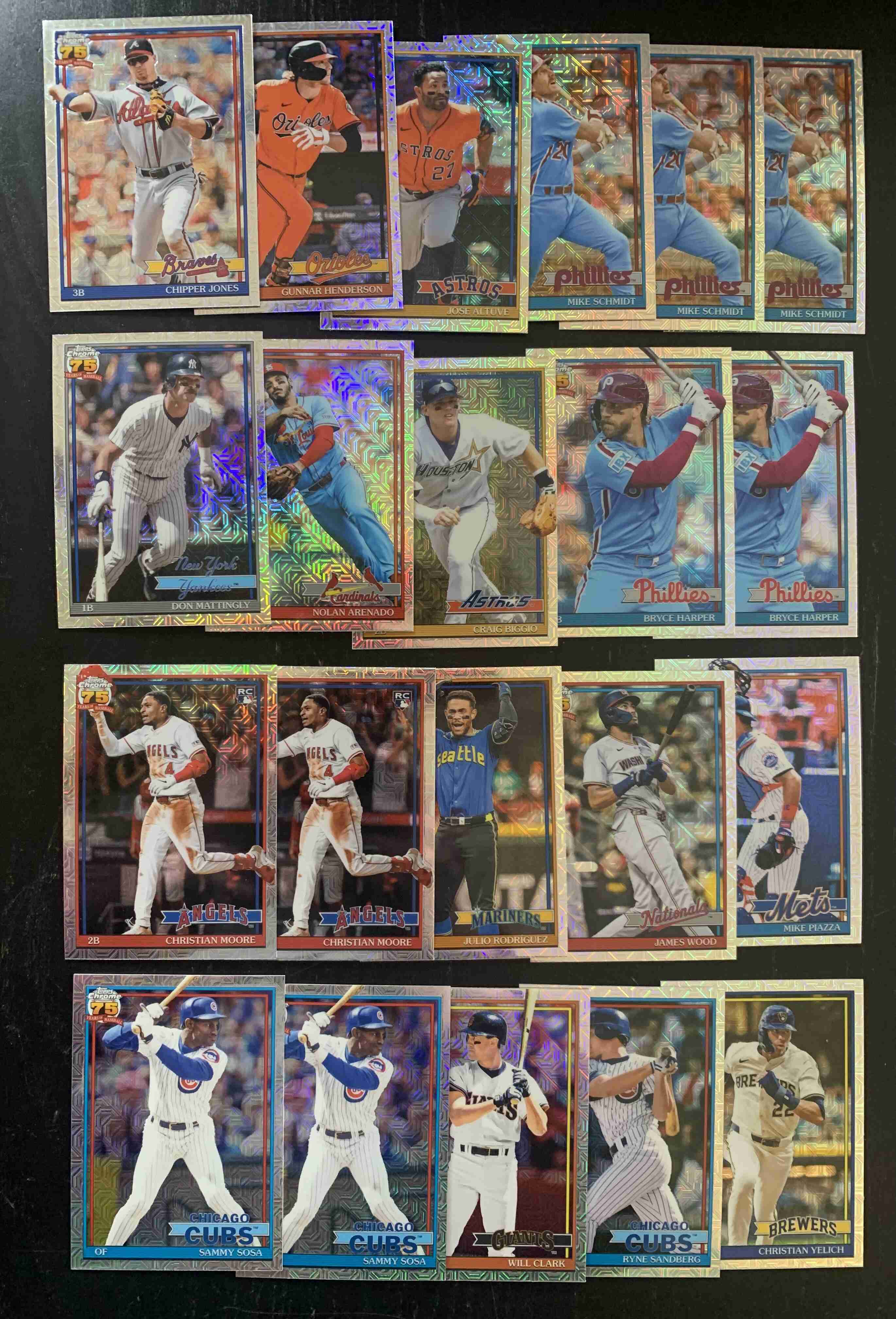 For auction is a lot of 21Silver Pack Mojo Refractors (1991 Design) from the BRAND NEW 2026 Topps Series 1 Set. Lot includes a mixture of Stars, Rookies and Legends. Lot does contain some duplication, with 3 cards of Schmidt. Every Card in the photos are included. Overall Cards are NM or better, though there may be outliers. Please refer to photos for more details. Cards ship securely with tracking via USPS.