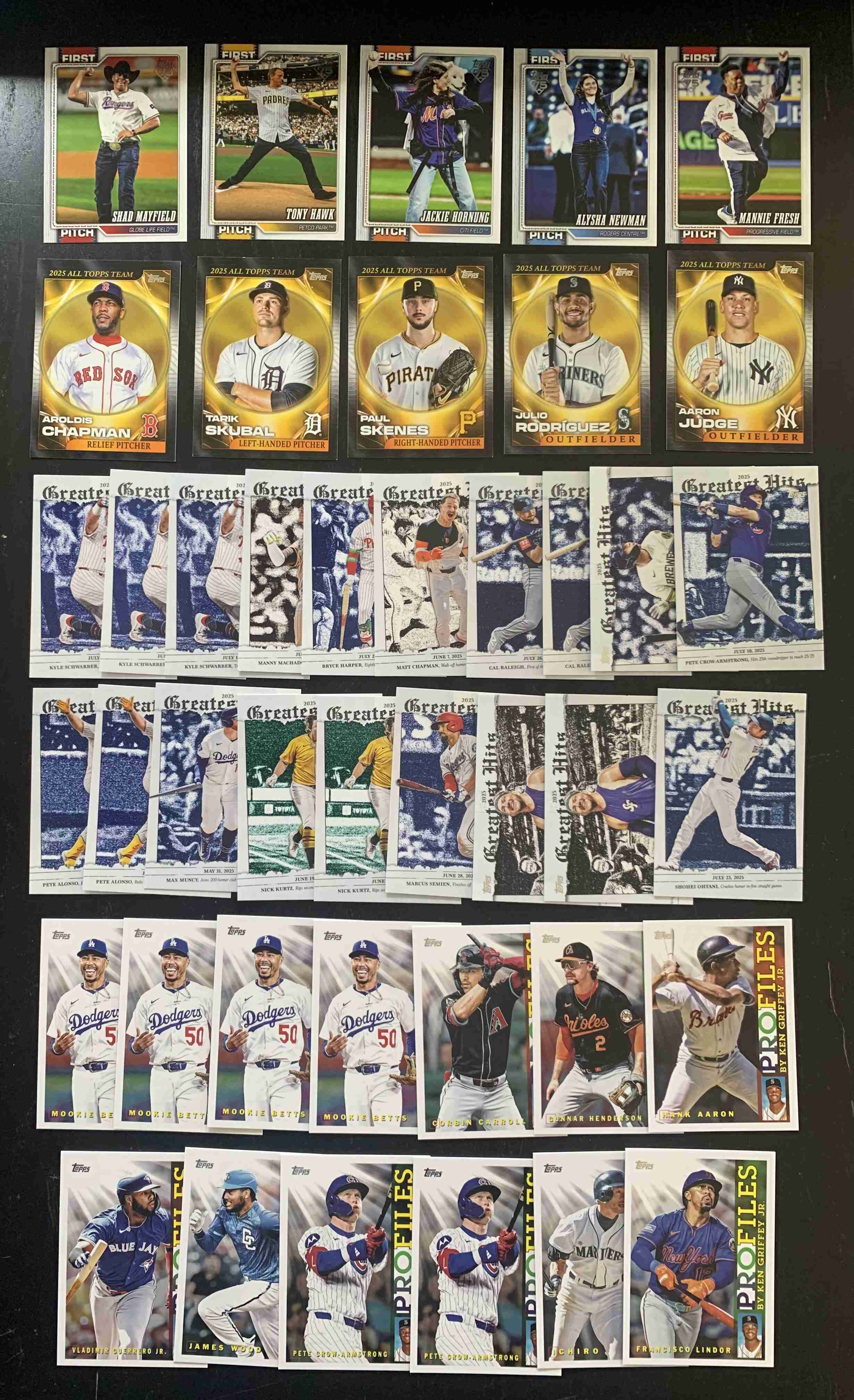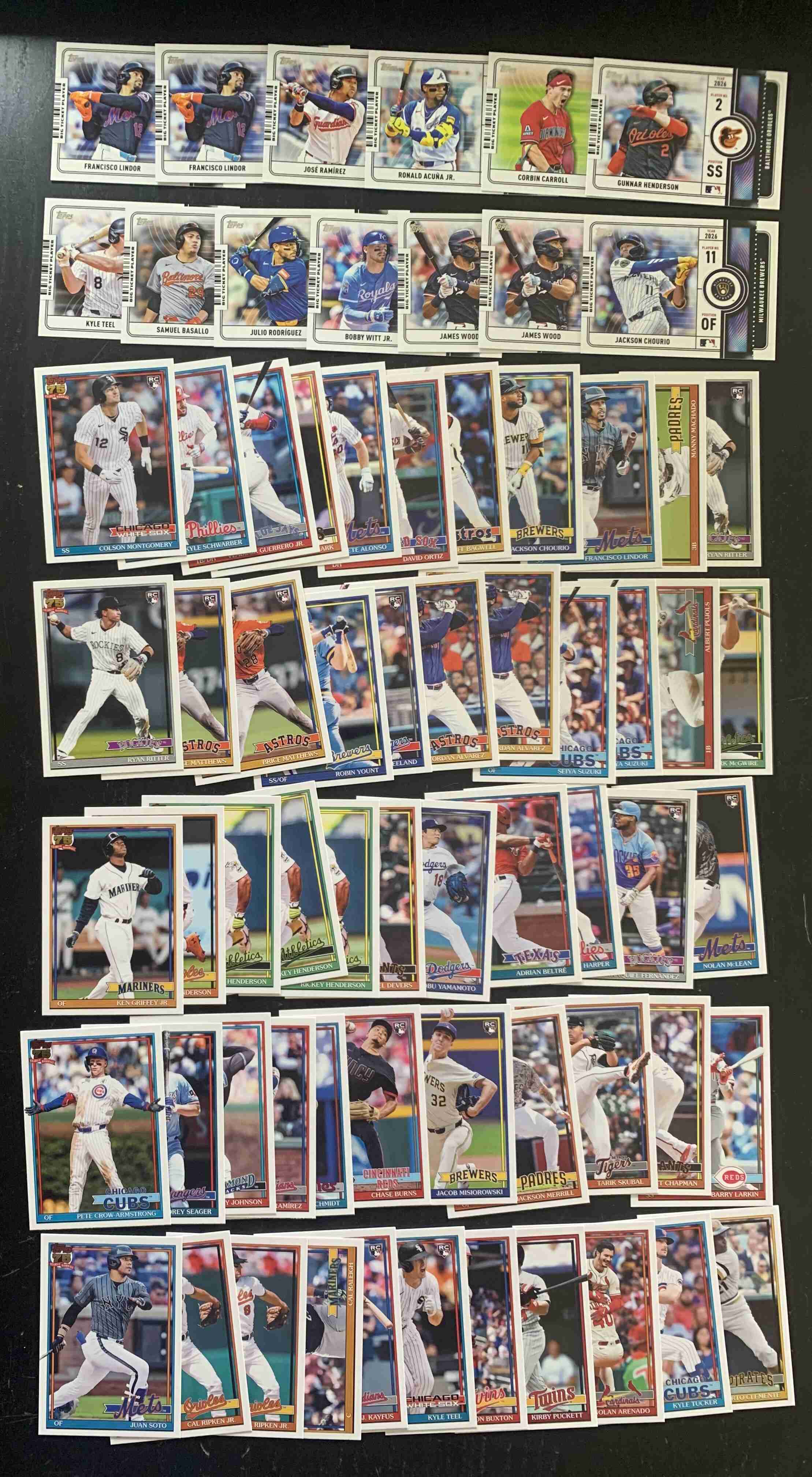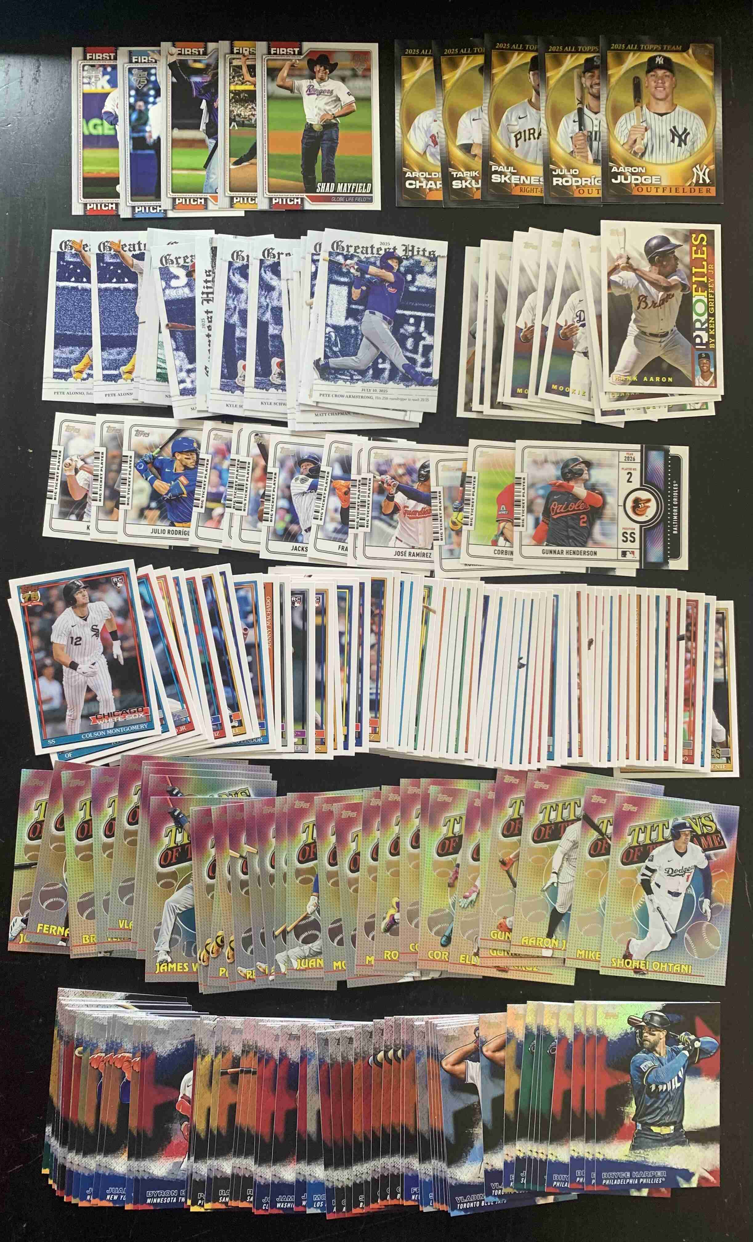 For auction is a lot of (roughly) 200 Assorted Insert Cards from the BRAND NEW 2026 Topps Series 1 Set. Lot includes a mixture of Rookies, Stars, and Legends. There is Duplication, with up to as many as 4-5 for some cards in limited instances. Lot Break Downs as Follows: First Pitch - 5 Cards | Big Ticket Players - 13 Cards | Profiles - 13 Cards | All Topps Team - 5 Cards | Greatest Hits - 19 Cards | 1991 35th Anniversary Inserts - 55 Cards | Titans of the Game (Retail Exclusive) - 34 Cards | Stars of the MLB (Retail Exclusive) - 58 Cards. Overall Cards are NM or better; however, the lot does include some outliers. Please refer to photos for more details - lot includes all cards pictured. Cards ship securely with tracking via USPS.