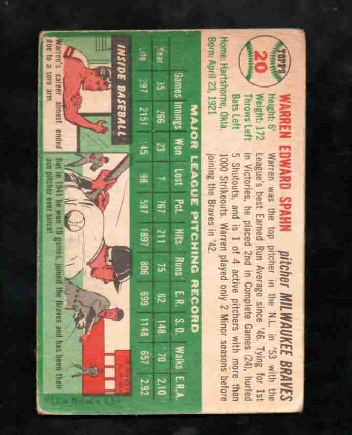 1954 Topps #20 WARREN SPAHN Milwaukee Braves