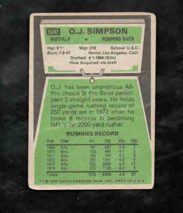 1975 Topps # 500 O.J. SIMPSON Buffalo Bills
