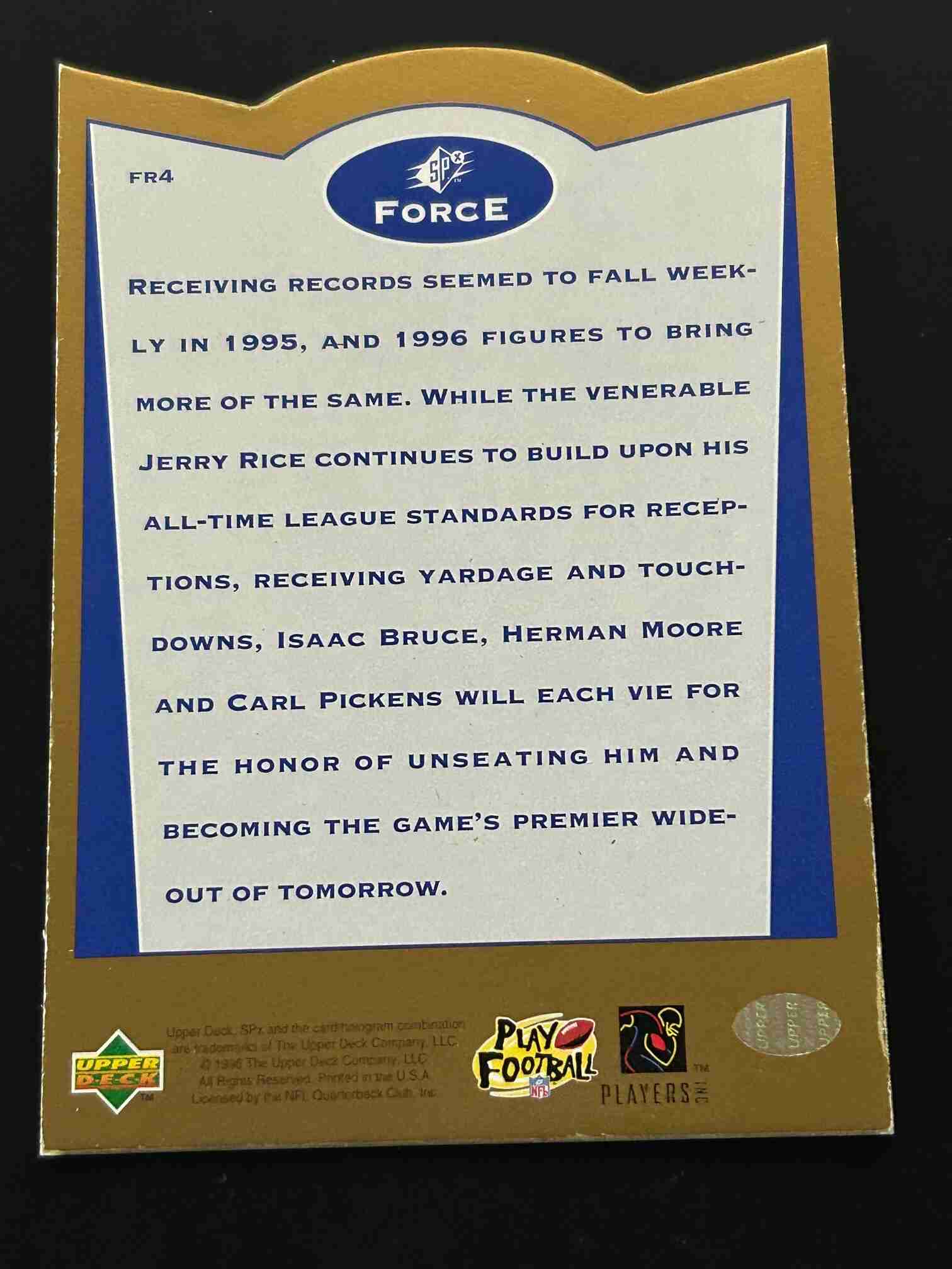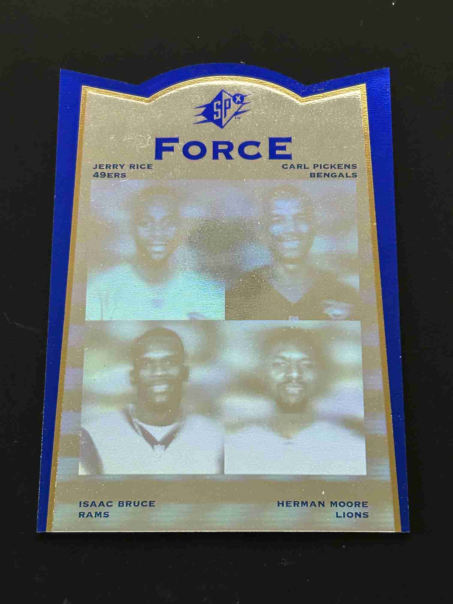 Ultra rare 1996 SPx Force Die Cut featuring Jerry Rice, Isaac Bruce, and Herman Moore. Check out my other items for cheap combined shipping.