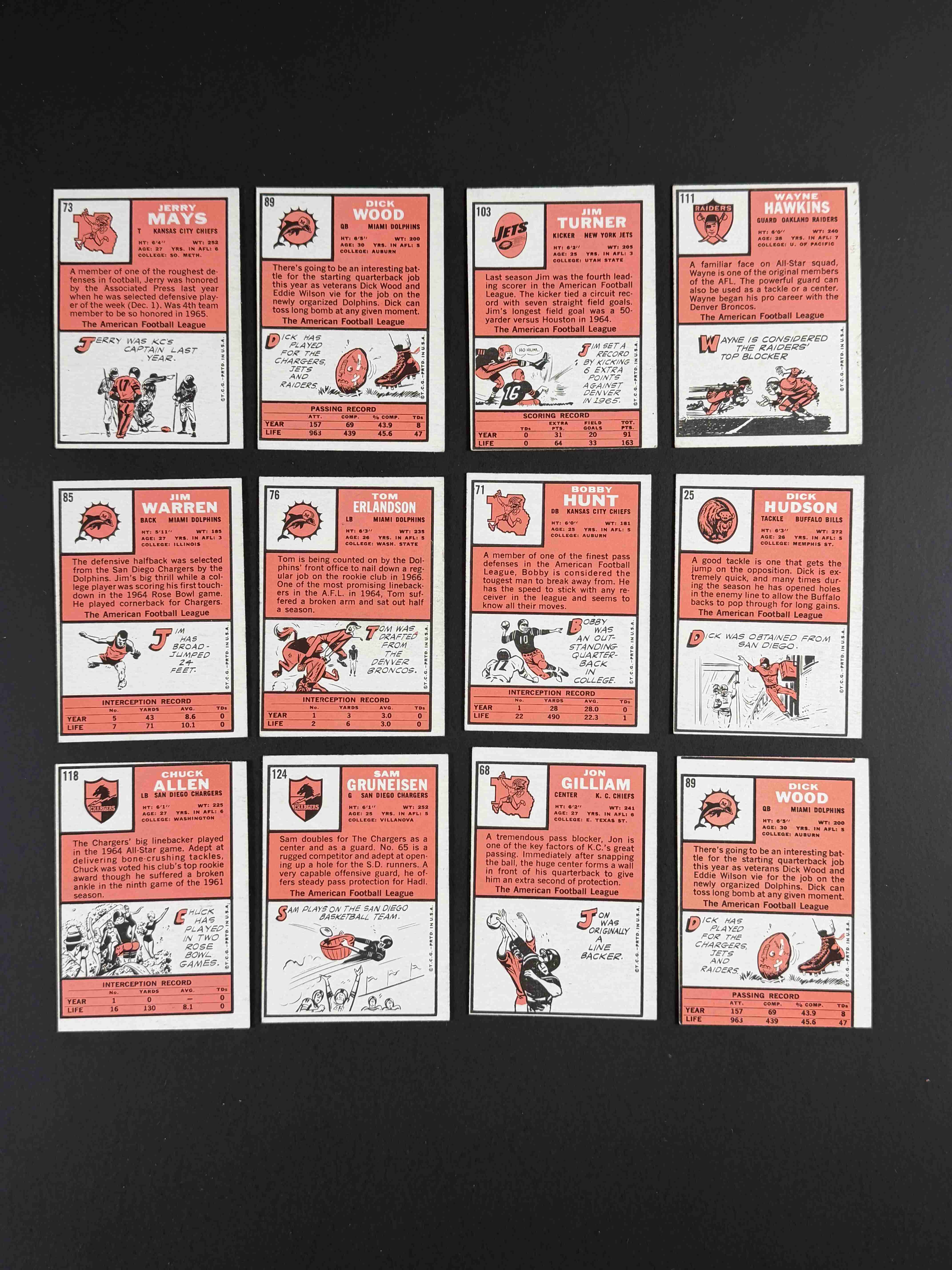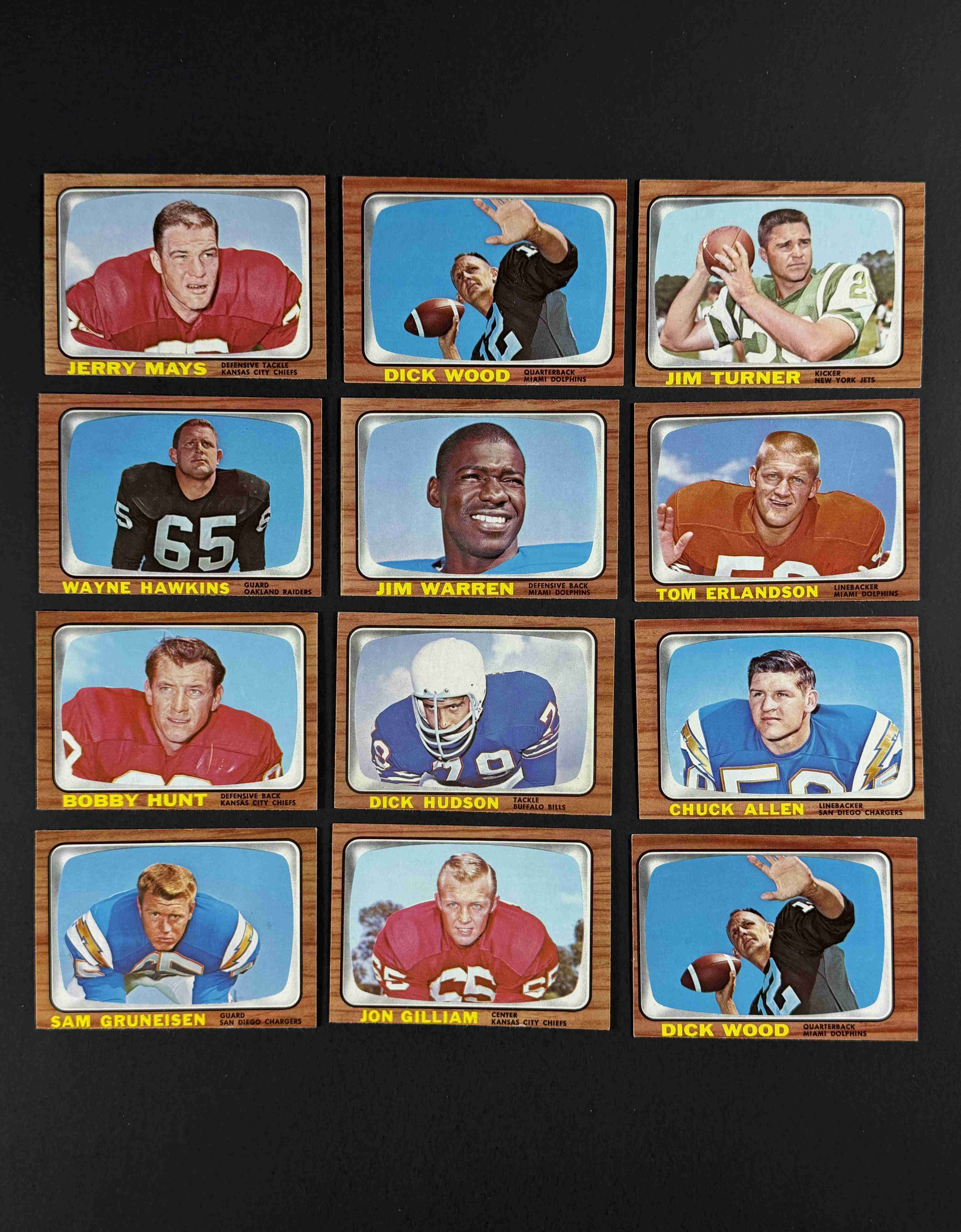 12- 1966 Topps Football cards. Doubles of Dick Wood. Overall condition is VG-EX with a couple being EX and one of the Dick Wood cards is miscut on the back.