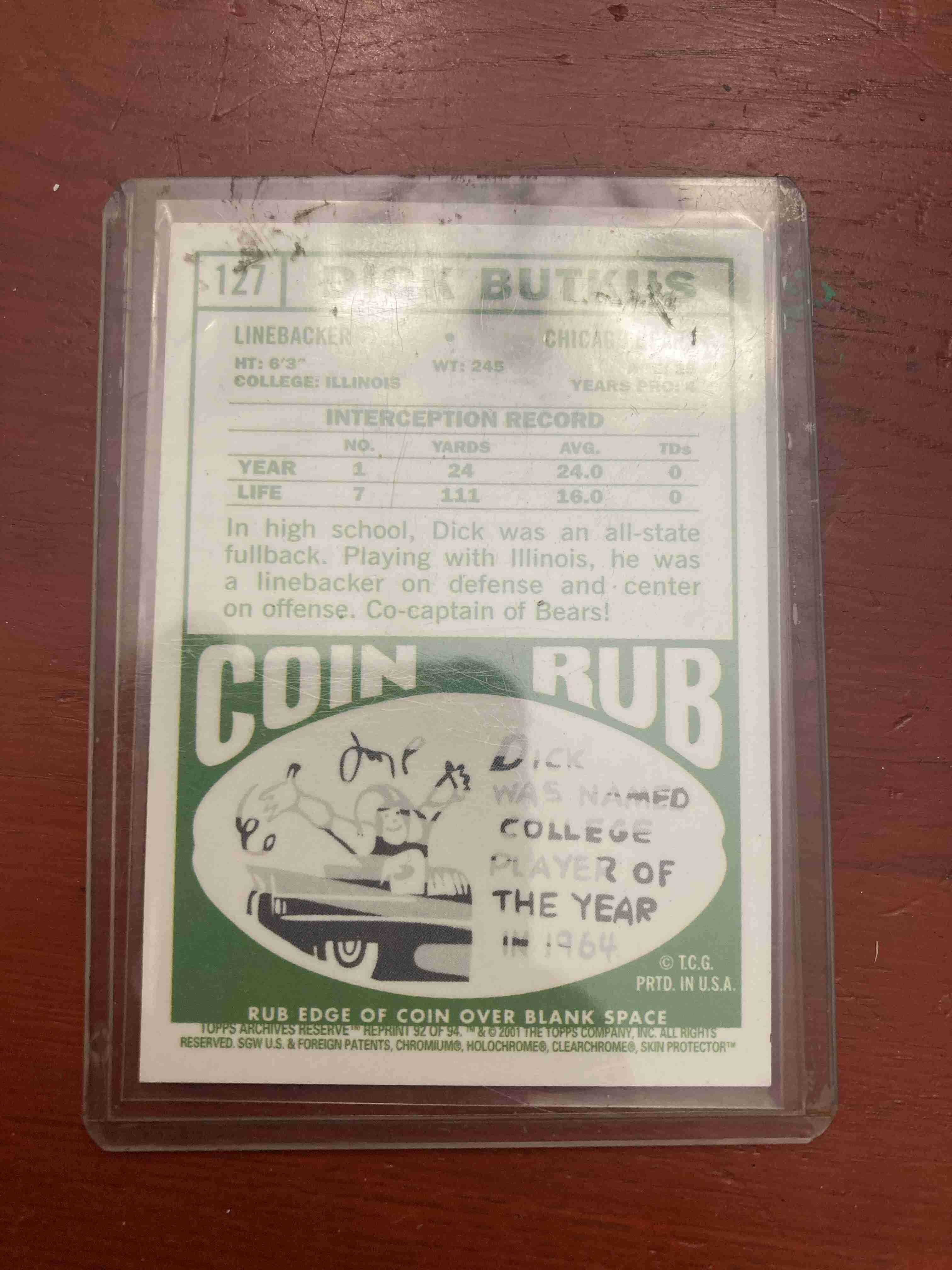 2001 Topps Archives Reserve Dick Butkus Coin Rub Card!