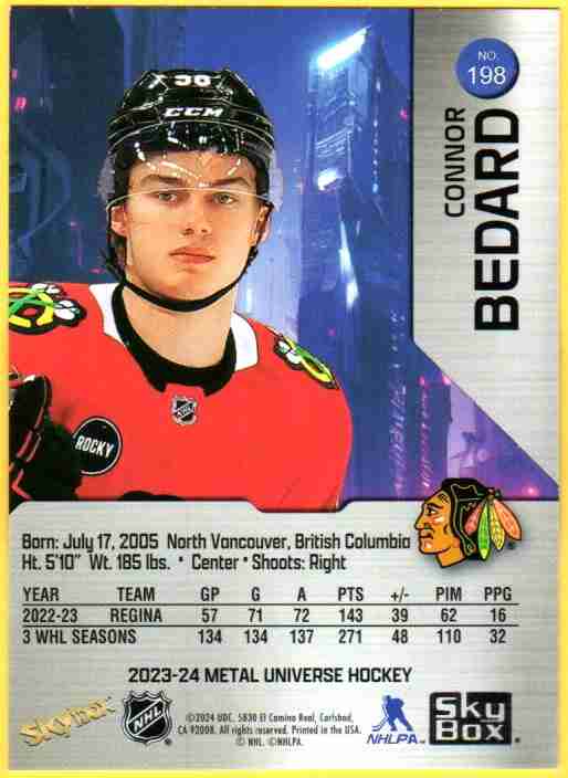 Connor Bedard #198 Rookie – 2023 SkyBox Metal Universe.
