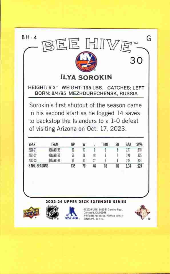 This listing is for a 2023-24 Upper Deck Extended Series Bee Hive insert card of Ilya Sorokin (#BH-4).