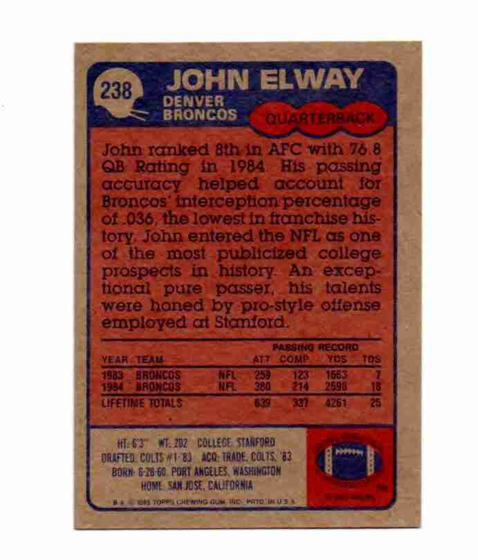 1985 Topps # 238 JOHN ELWAY Denver Broncos