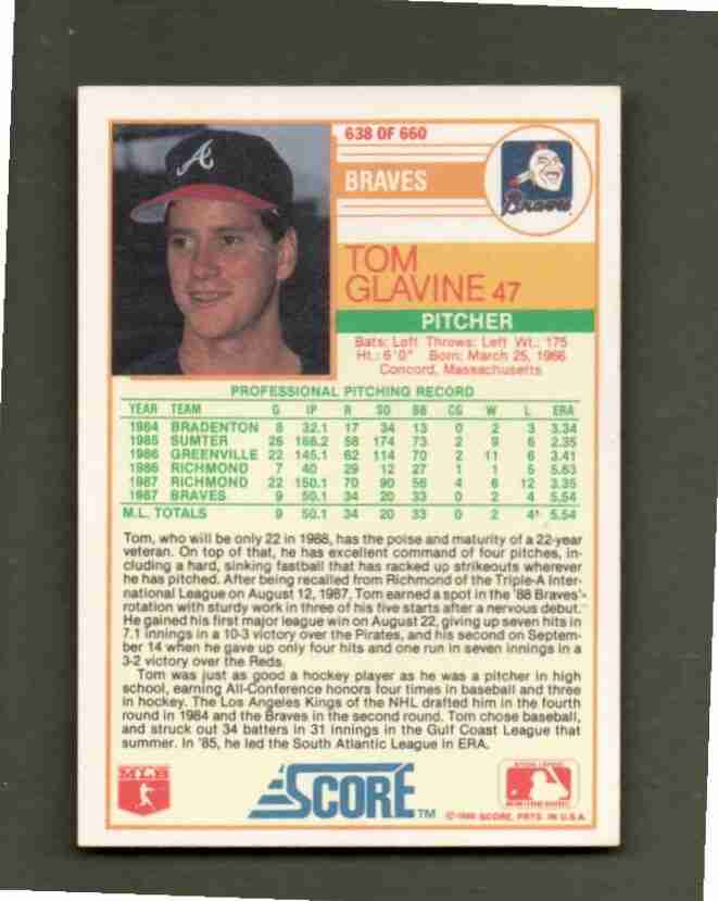 1988 Score # 638 TOM GLAVINE Atlanta Braves