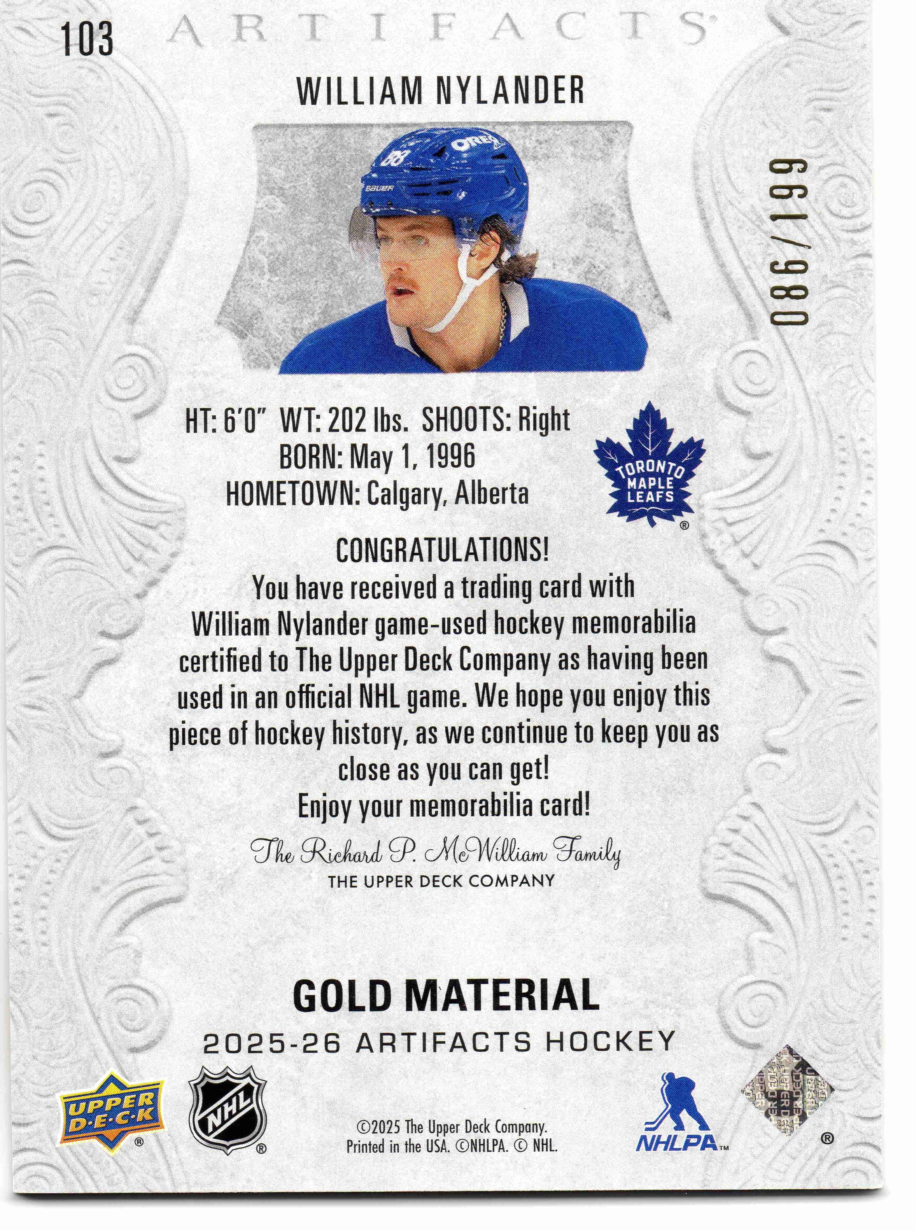 William Nylander 2025 Artifacts Gold Material #103. Further numbered 086/199.
