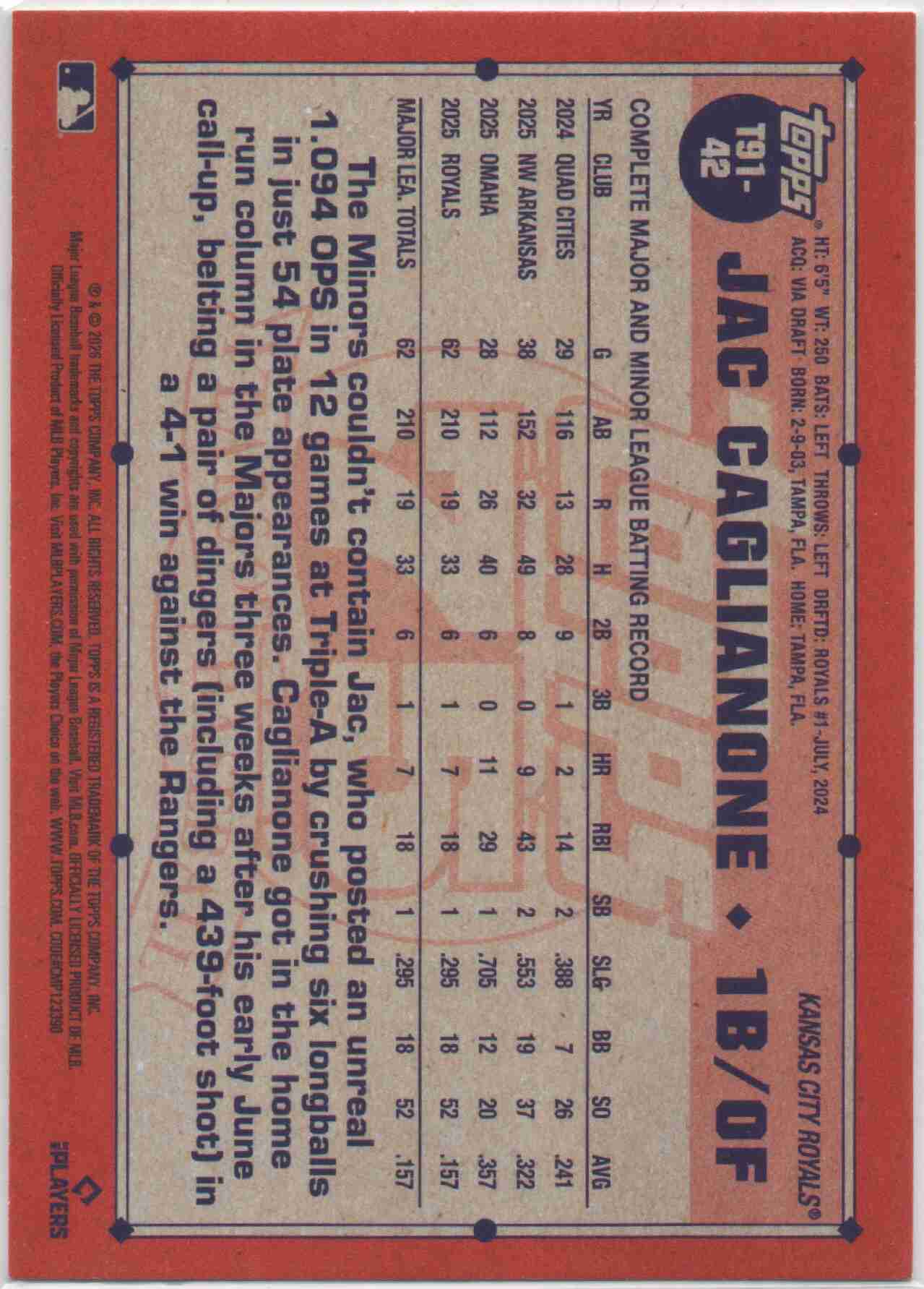 Jac Caglianone 2026 Topps 1991 Rookie Insert #T91-42