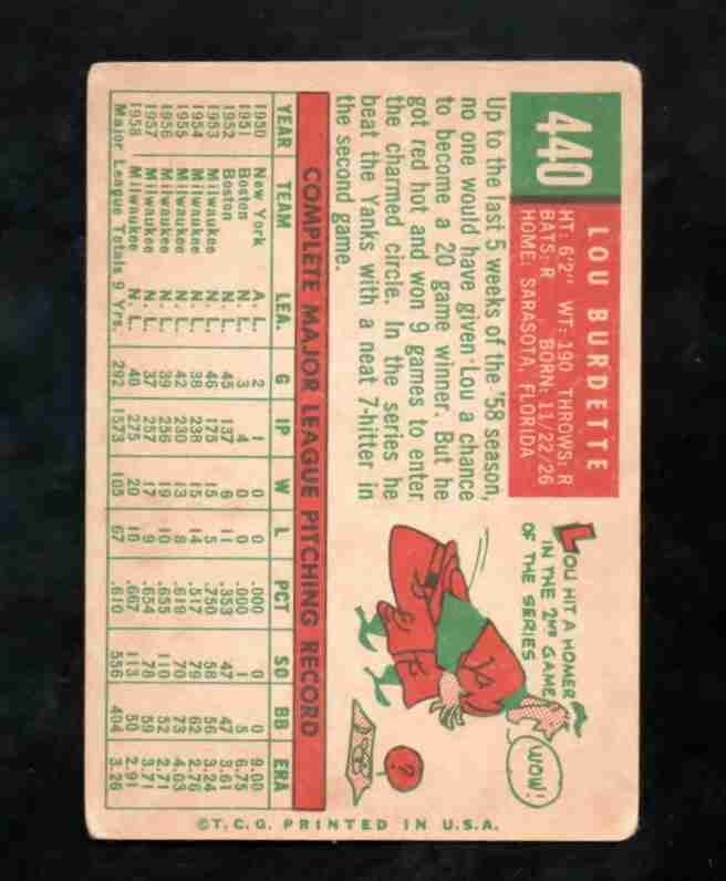 1959 Topps # 440 LOU BURDETTE Mil. Braves