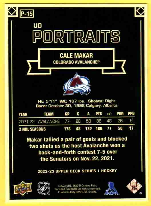 This is the 2022-23 Upper Deck UD Portraits #P-15, featuring Makar following his Norris and Conn Smythe caliber seasons.