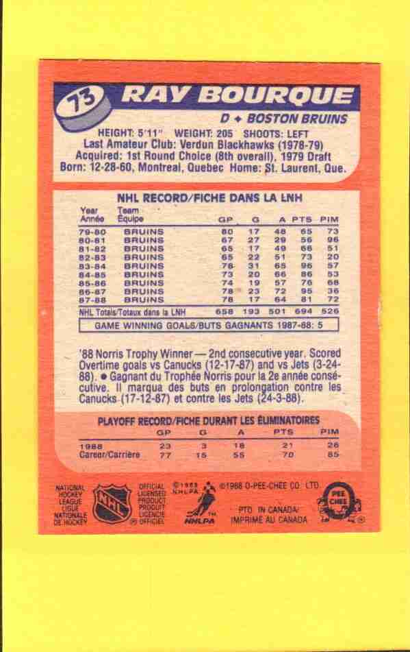 Ray Bourque #73 | 1988 O-Pee-Chee | Boston Bruins | HOF | OPC Vintage Hockey Card