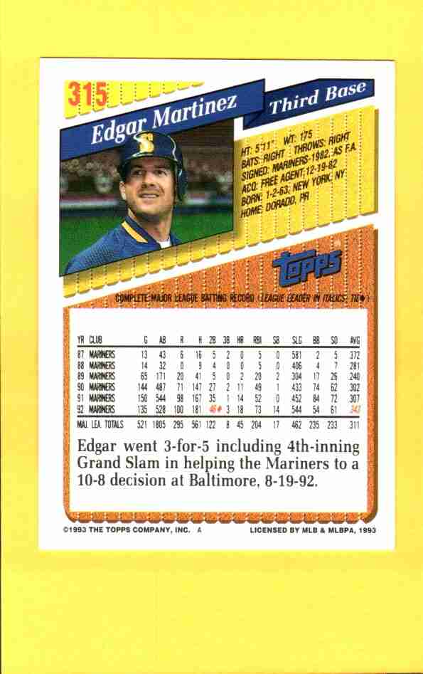 Edgar Martinez #315 – 1993 Topps Gold – Seattle Mariners
