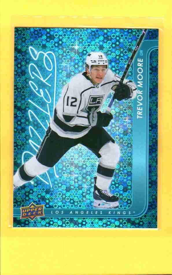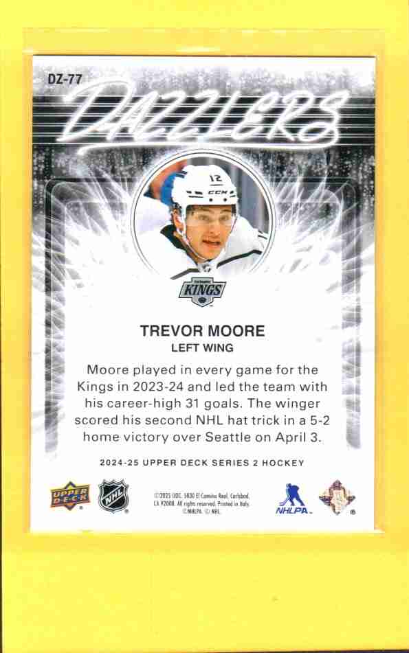Trevor Moore 2024-25 Upper Deck Dazzlers Blue #DZ-77. Bright, flashy foil insert featuring the Kings’ rising scorer after his career-best 31-goal season. Sharp surface, vibrant color—great collectible for LA fans.