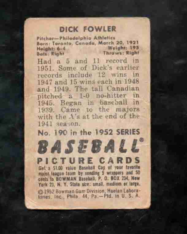 1952 Bowman # 190 DICK FOWLER Phil. Athletics