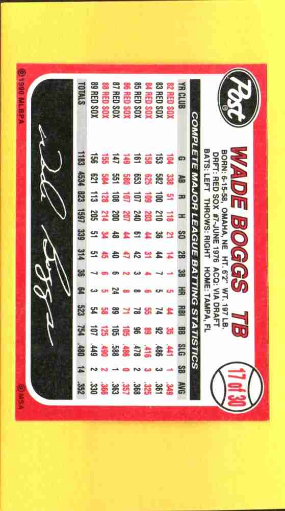 1990 Post Cereal Wade Boggs #17 of 30 – Boston Red Sox. Crisp photo and clean borders with strong color for this food-issue release. Classic collectible of the Hall of Fame third baseman.
