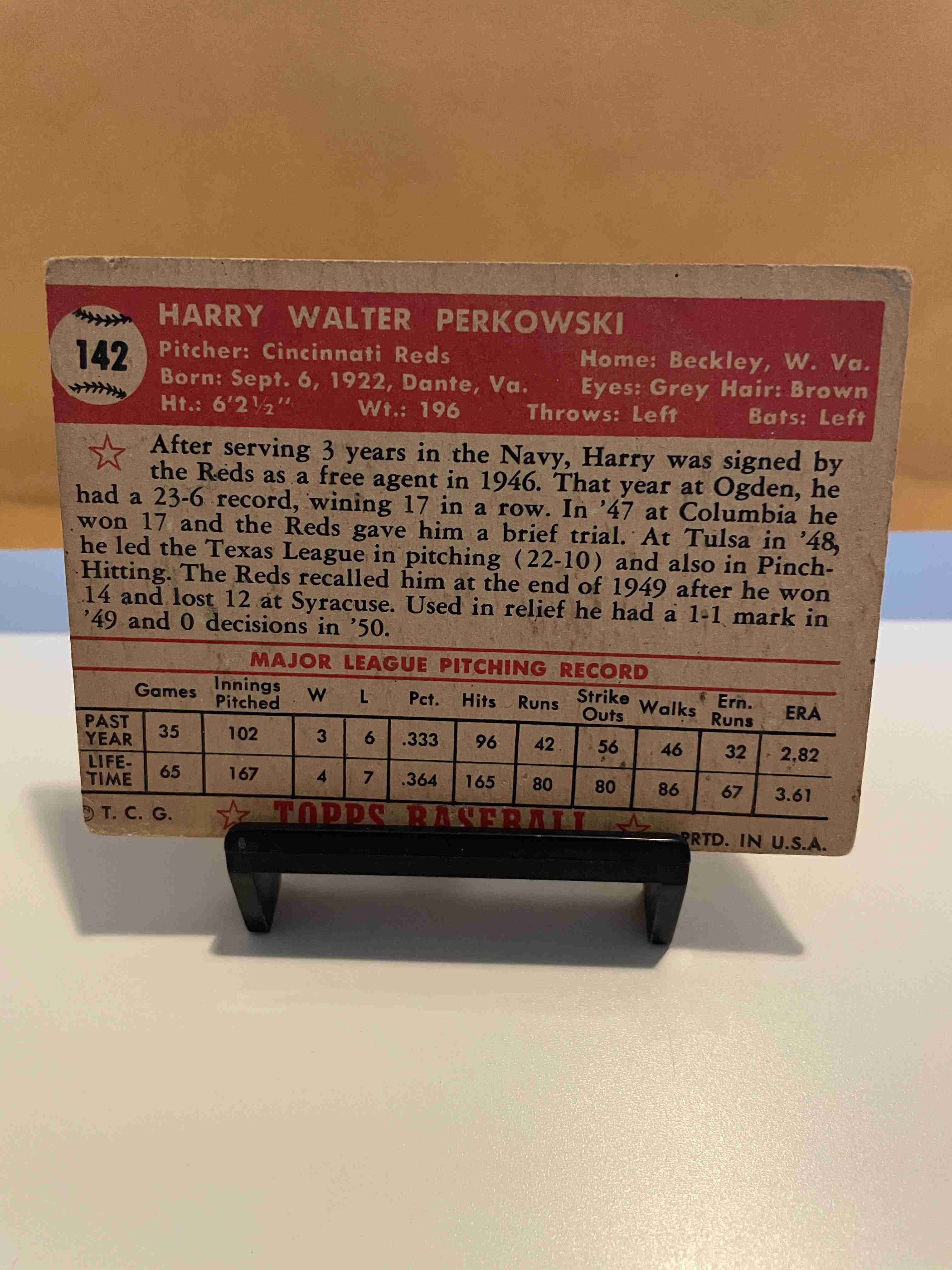 1952 Topps #142 Harry Perkowski Reds No creases, but corners are worn.