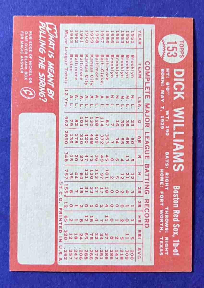 64 Topps DICK WILLIAMS #153 HOF!