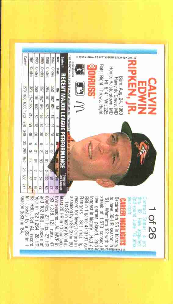 Cal Ripken Jr #1 1992 Donruss McDonald's MVP