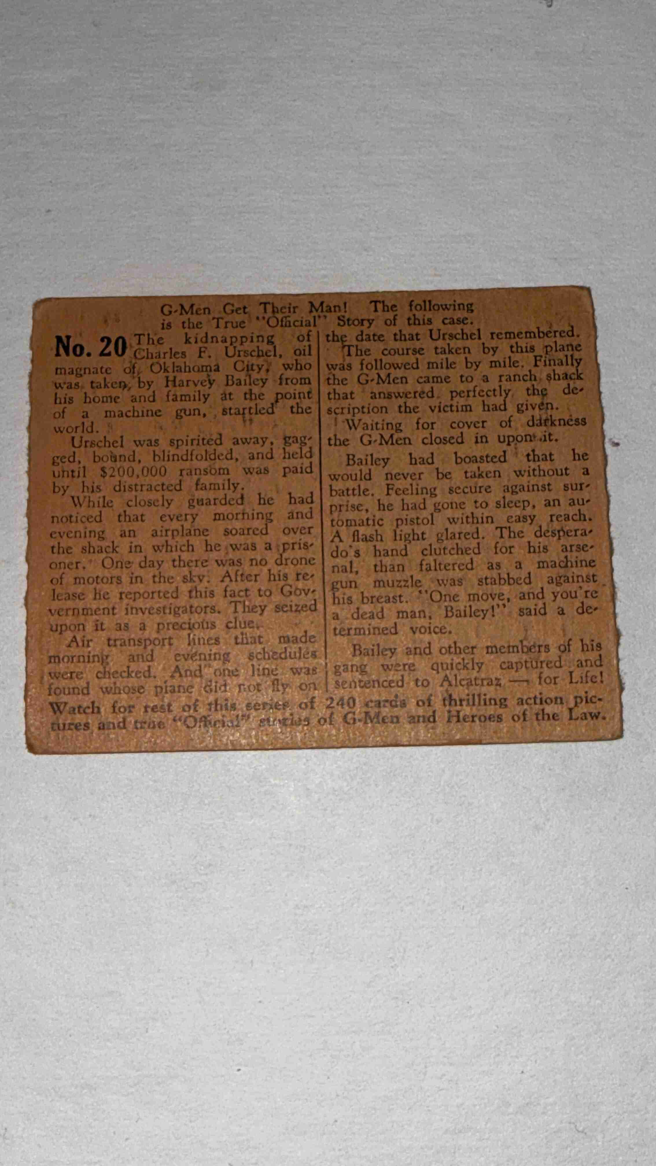 1936 Gum Inc. G-Men & Heroes of the Law #20 Harvey Bailey Run Down Daring Kidnap