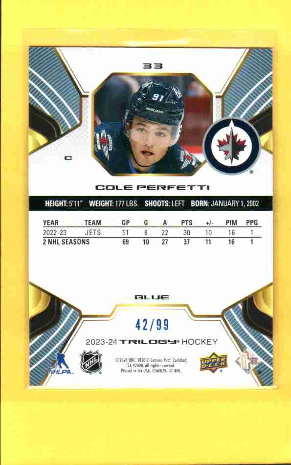Cole Perfetti – 2023-24 Upper Deck Trilogy Blue #33 /99.