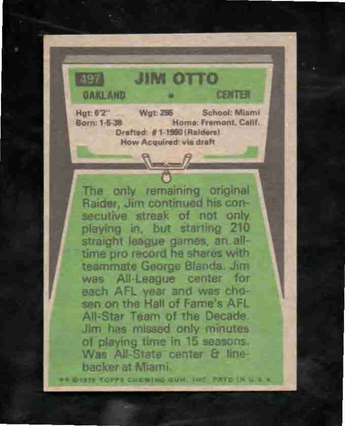 1975 Topps # 497 HOFer JIM OTTO Raiders