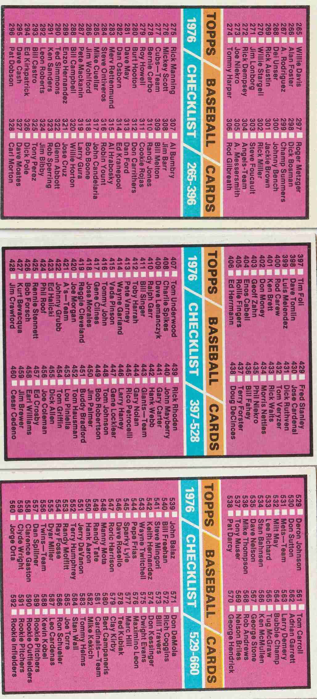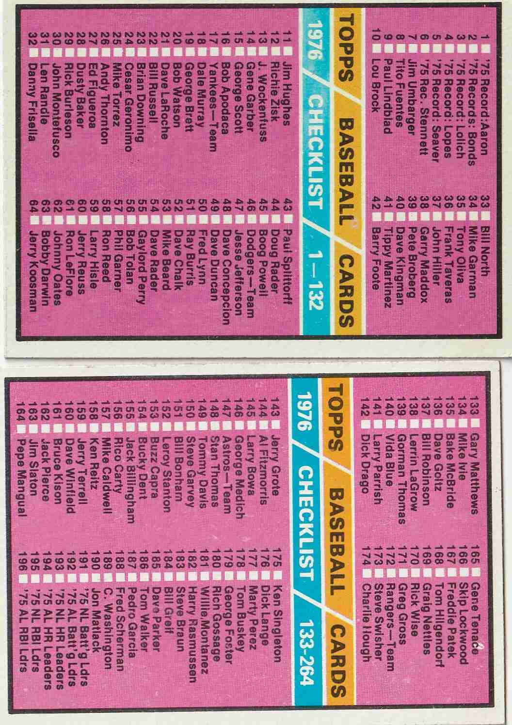 6- Topps 1976 Baseball Checklists (see pics/descriptions)