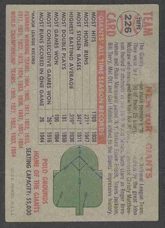 1956 TOPPS NEW YORK GIANTS TEAM (GREY BACK) #226