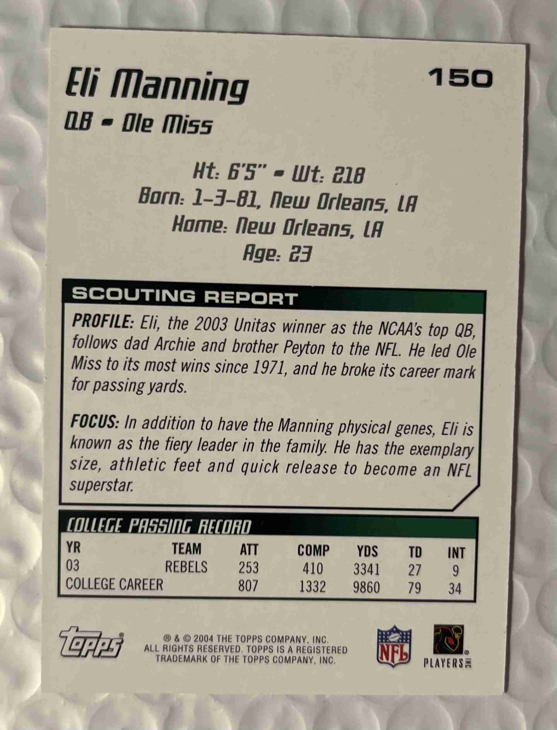 2004 Topps Draft Picks & Prospects Eli Manning Rookie Card