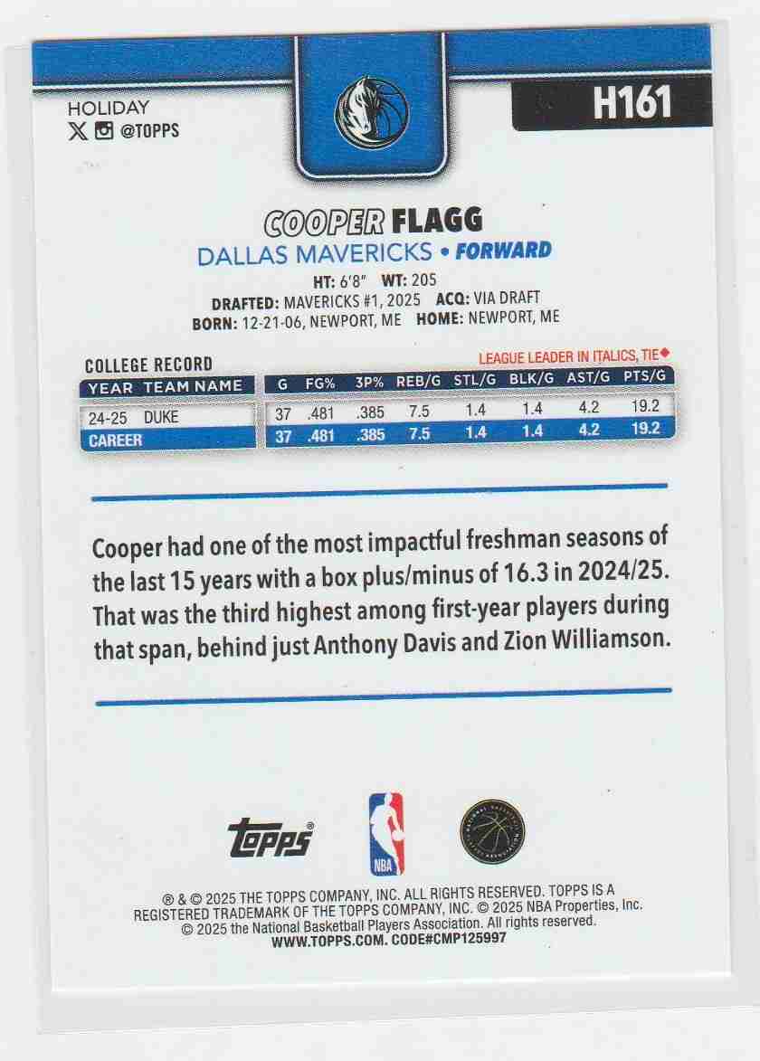 The #1 overall draft pick in 2025, Cooper Flagg is quickly making his mark on the NBA courts across the country with the Dallas Mavericks. To date, his trading cards' continue to be one of the most highly sought after. Whether you are looking to add to your card collection or seeking an investment card, the 2025 Topps Holiday card #H-161, is definitely a card worth pursuing.