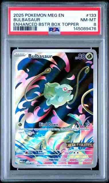 2025 POKEMON MEG EN-MEGA EVOLUTION #133 BULBASAUR ENHANCED BSTR BOX TOPPER PSA-8.