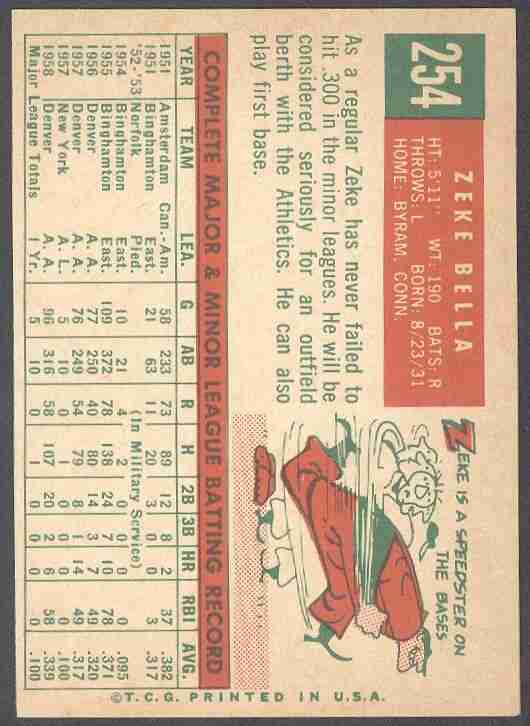 1959 TOPPS ZEKE BELLA (WHITE BACK) #254 - HIGH GRADE