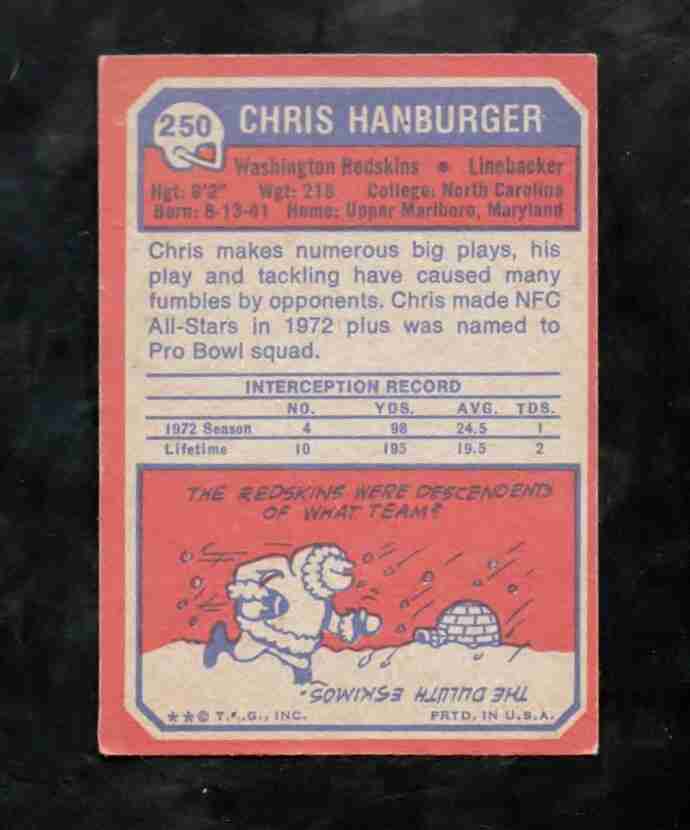 1973 Topps # 250 CHRIS HANBURGER Wash, Redskins