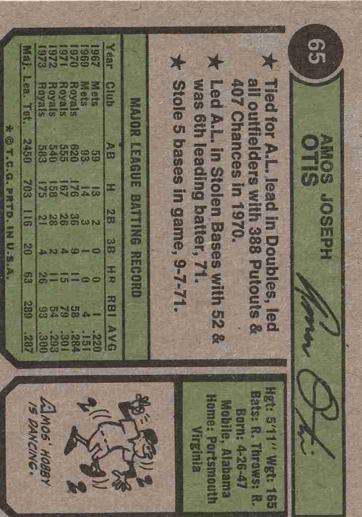 2-1974 Topps KC Royals #'s 65 Otis #88 Patek
